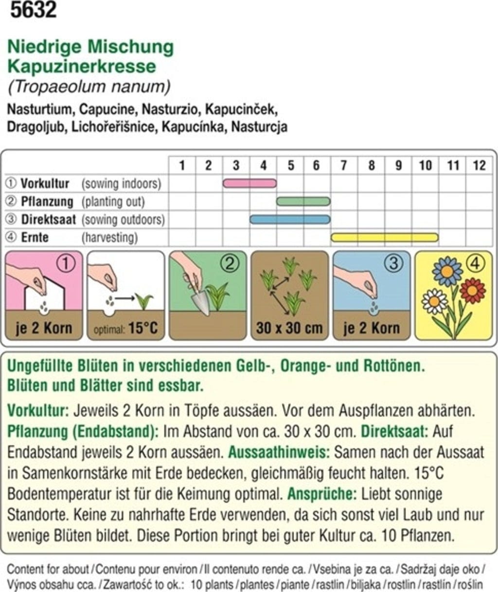 Směs květů v různých odstínech žluté, oranžové a červené. Tato odrůda je nízkého vzrůstu. Semena pocházejí z ekologického zemědělství.