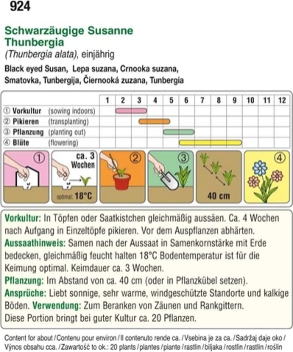 Popínavá rostlina „Černooká Zuzana“ je spíše pomalu rostoucí, ovíjivá rostlina. Žloutkově žluté květy s černým středem jsou skvělým doplňkem, který upoutá pozornost na plotech a mřížích.