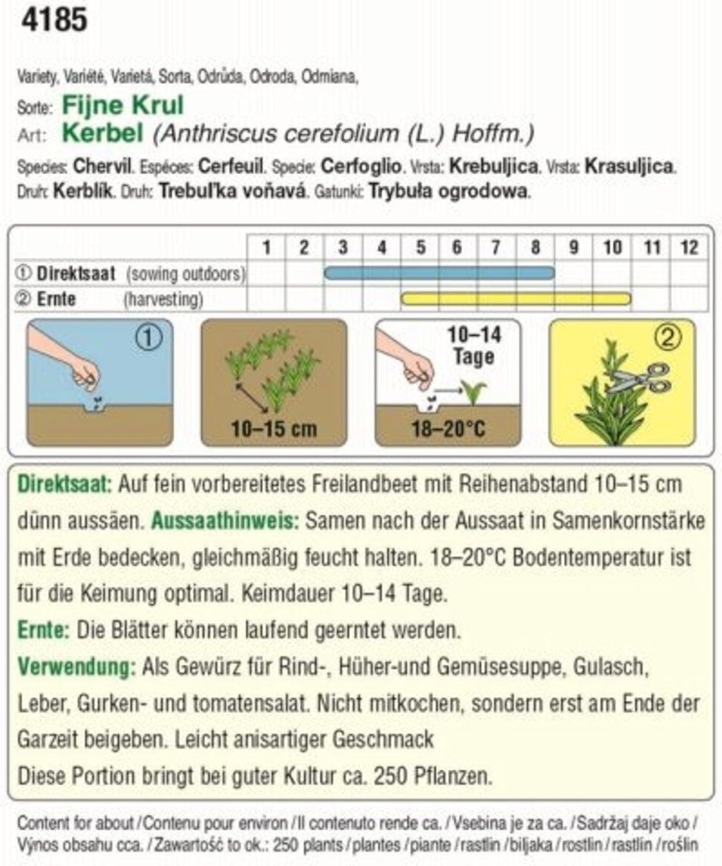 V nestříhaném stavu dorůstá výšky cca 40 cm. Listy lze sklízet průběžně. Chuť je lehce anýzová.