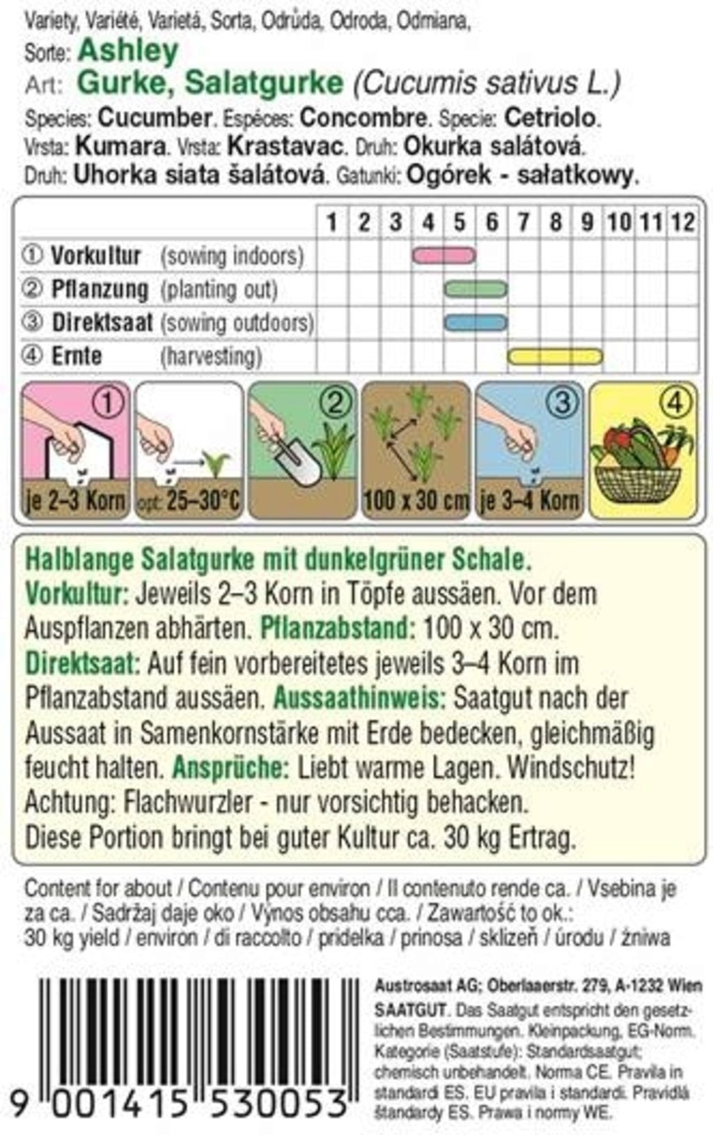 „Ashley“ je poloraná, polodlouhá salátová okurka s tmavě zelenou slupkou. Ideální do salátů nebo jako hořčičná a kvašená okurka.