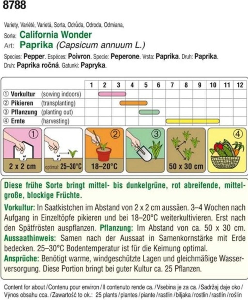 Raná odrůda s velkými, kvádrovitými plody. Mění barvu v závislosti na stupni zralosti z tmavě zelené na červenou. Vhodná také pro pěstování ve fóliovnících.