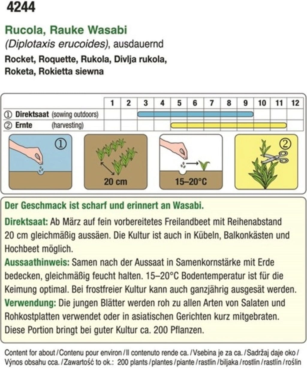 Roketa Wasabi je vytrvalá odrůda, která svou ostrou chutí připomíná wasabi. Pěstování na zahradním záhonu, stejně jako v nádobách, balkonových truhlících a vyvýšených záhonech, je bez problémů možné. Mladé listy jsou vhodné buď syrové do salátů, nebo krátce orestované pro přípravu asijských pokrmů.