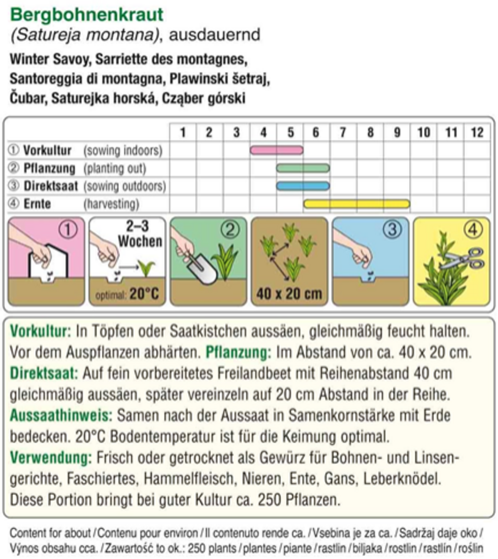 V neseříznutém stavu dorůstá výšky 30-40 cm. Sklizeň listů probíhá během květu. Své úžasné aroma si saturejka horská uchovává i po usušení. Díky své ostré, lehce peprné chuti se tato bylinka ideálně hodí k vydatným pokrmům.