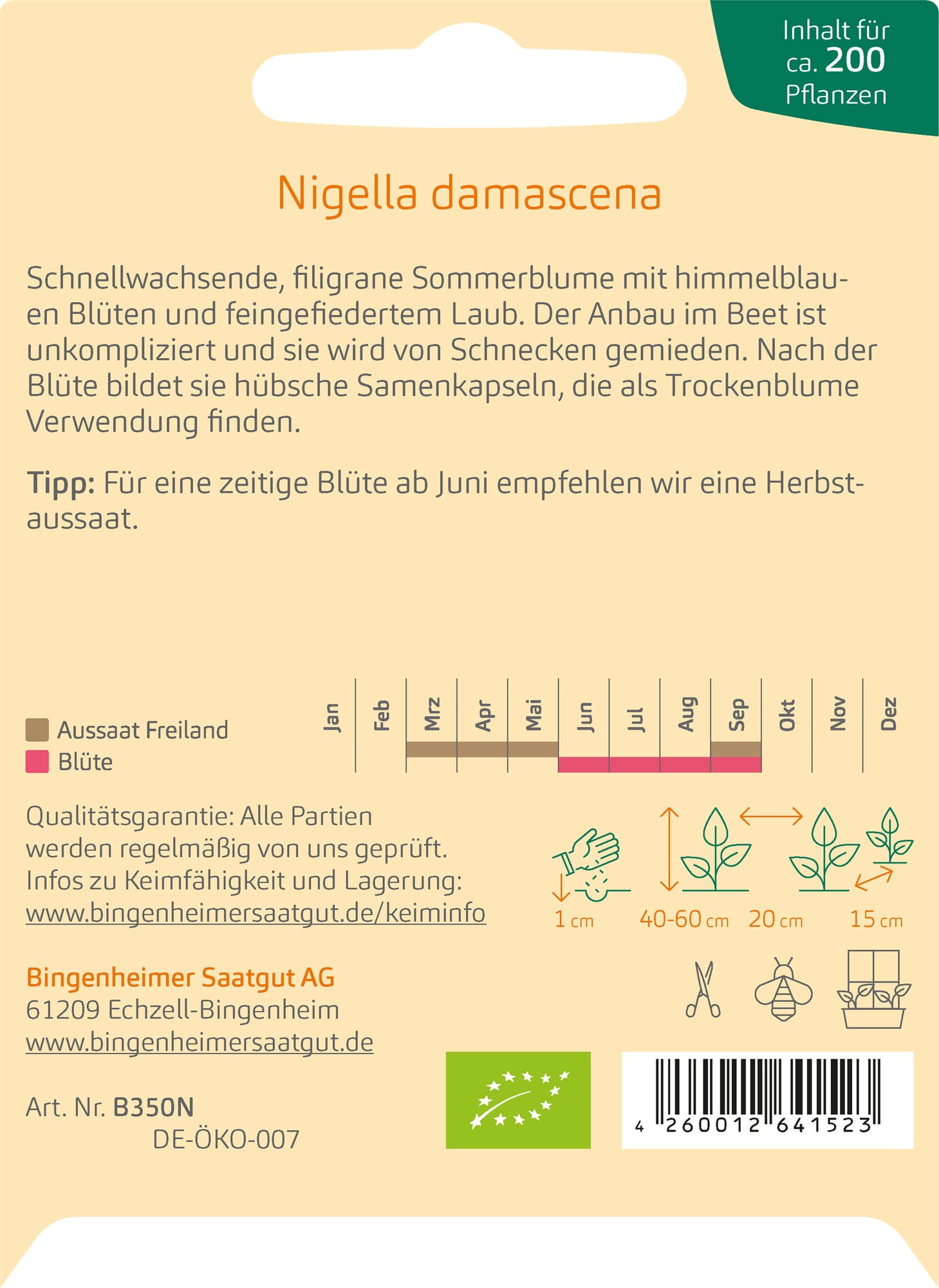 Nebesky modré květy a jemně zpeřené listy dodávají této letničce obzvláště jemný vzhled. Její semeníky, které se objevují po odkvětu, jsou skvělé jako sušené květiny.