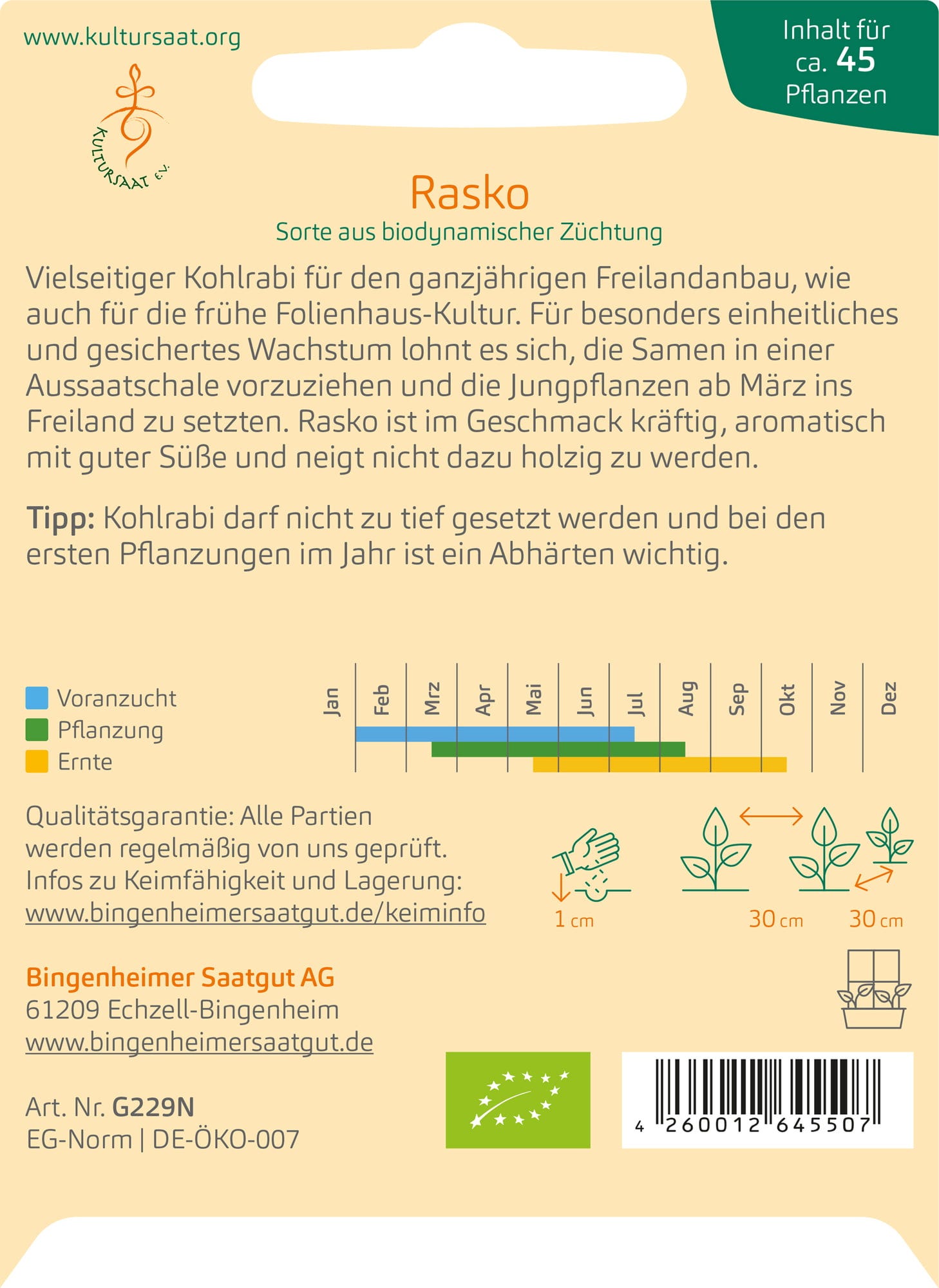 Kedluben "Rasko" je vhodný pro celoroční pěstování venku, ale skvěle se mu daří i ve fóliovníku. Ploše kulovité bulvy mají výrazné aroma se sladkým nádechem. Konzistence je pevná, přesto však nehrozí, že by bulvy dřevnatěly.