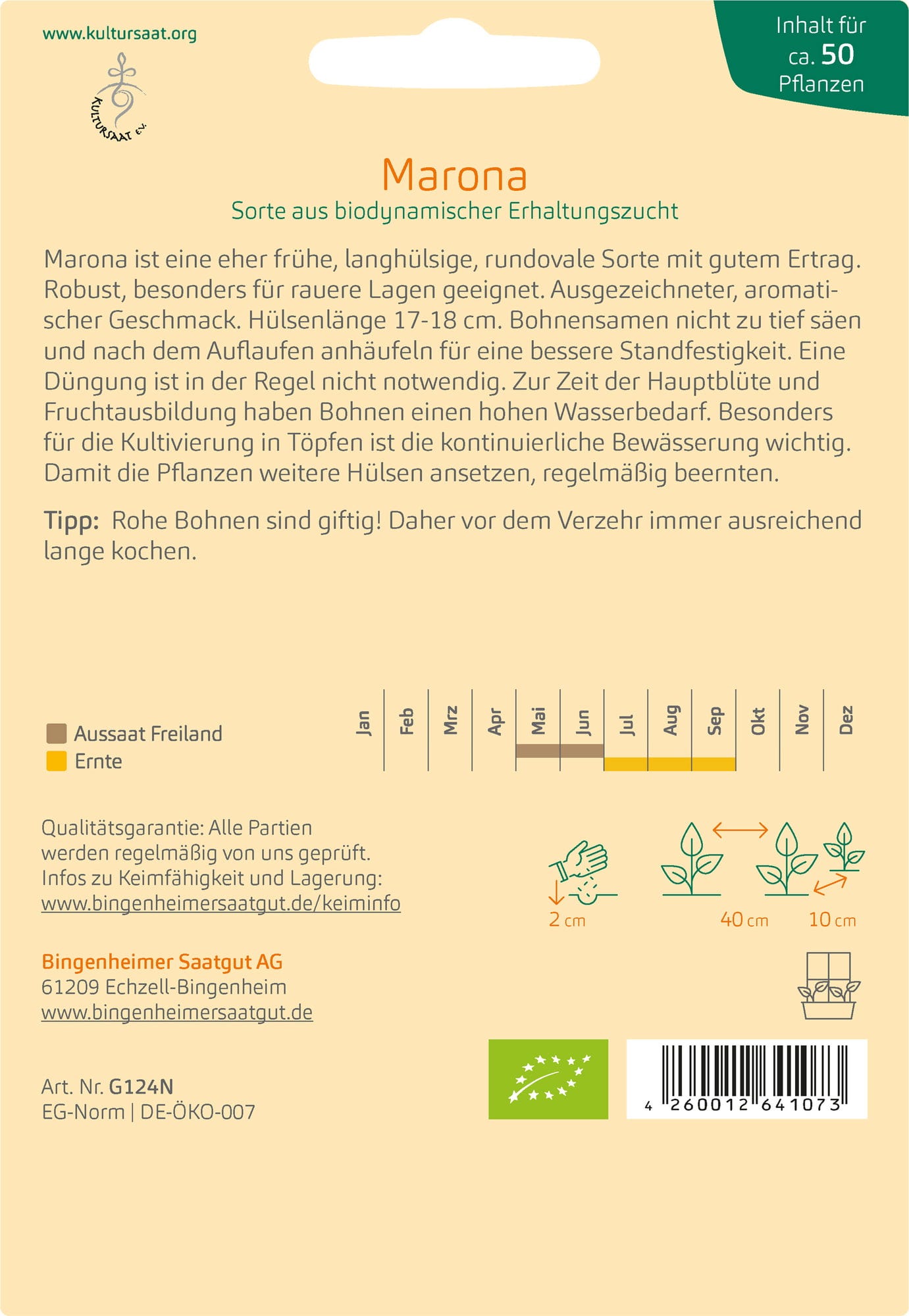 Robustní odrůda keříčkové fazole „Marona“ je vhodná i do drsnějších poloh. Dlouhé lusky o délce 17-18 cm se objevují velmi brzy a mají mimořádně aromatickou chuť.