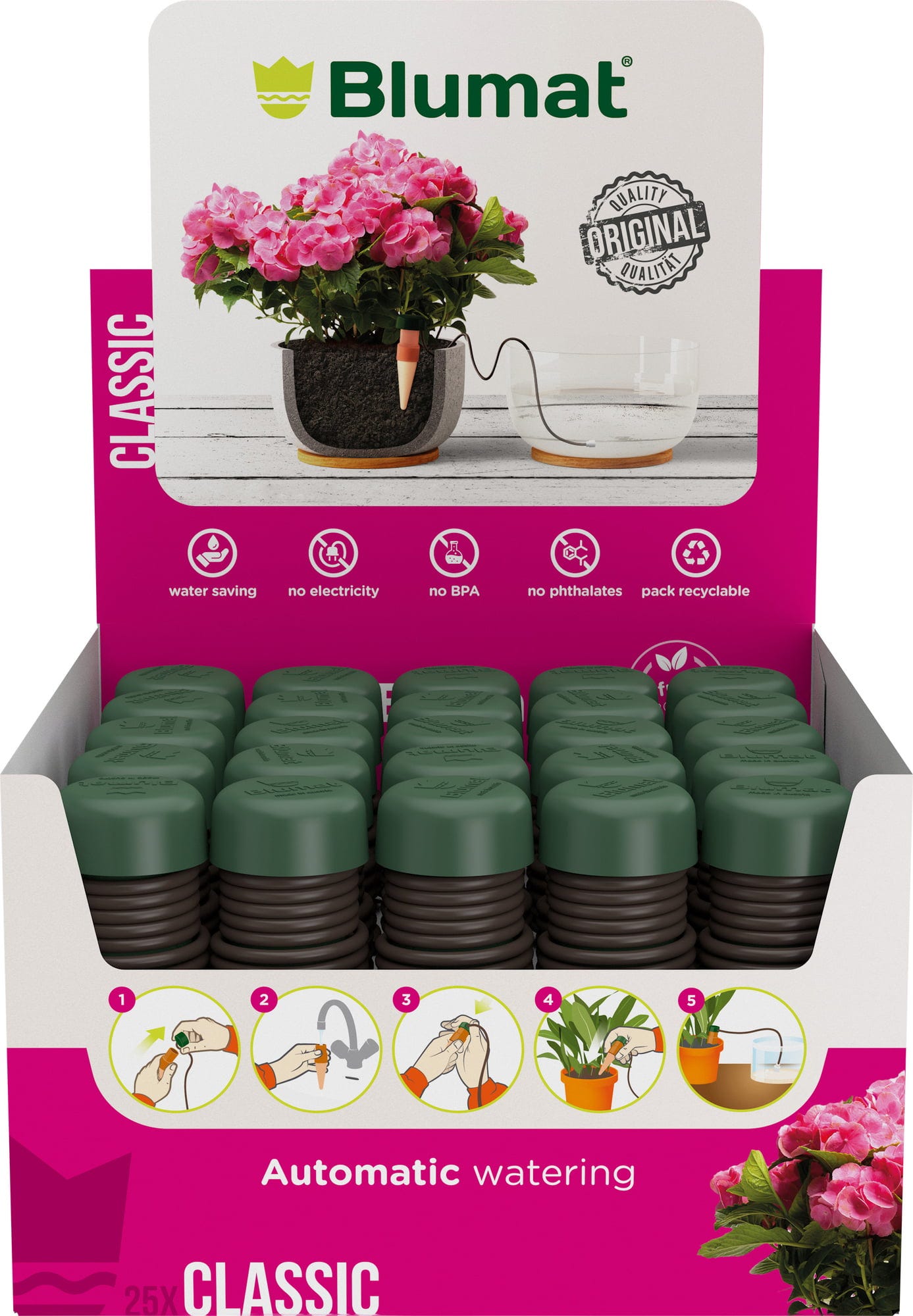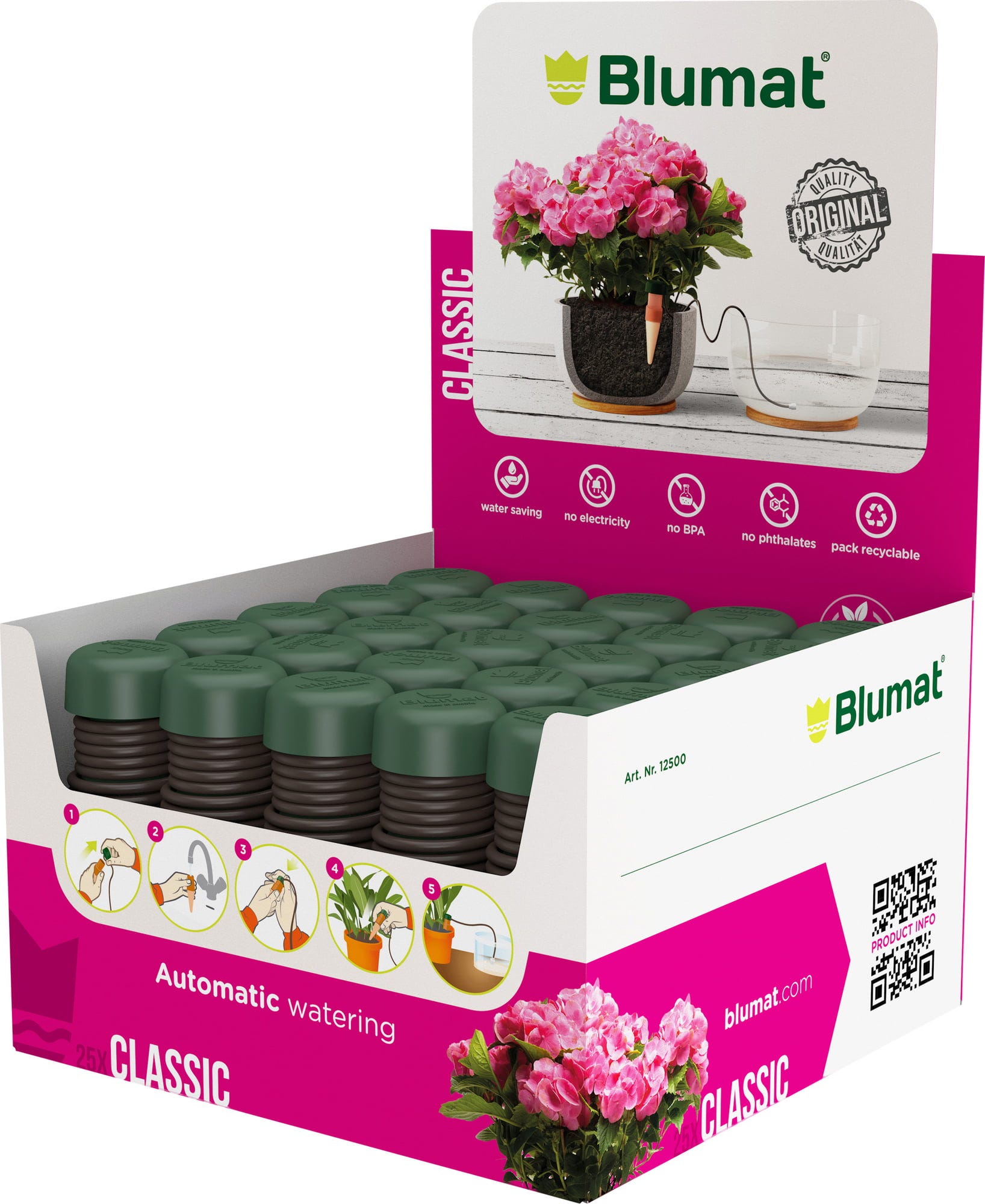 Blumat je plně automatický zavlažovací systém pro rostliny, který je zásobuje vodou přímo přes svůj porézní hliněný kužel tak, že půda v pěstební nádobě z něj vysává vodu. Voda pochází ze zásobní nádoby umístěné vedle pěstební nádoby a stoupá přibližně 80 cm dlouhou hadicí do květináče. Tímto způsobem může být rostlině dodáno 200 ml vody denně. Tato přepravní kapacita je přesně přizpůsobena spotřebě vody pokojových rostlin. Volbou mezi dvěma různými velikostmi kuželů lze dodávané množství přizpůsobit příslušné potřebě. Pozor: Aby systém fungoval, musí být hladina vody v zásobní nádobě níže nebo maximálně stejně vysoko jako pěstební nádoba.
