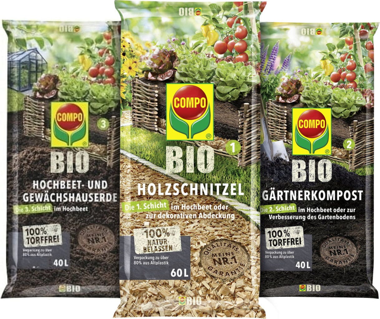 Při zakládání vyvýšeného záhonu se COMPO BIO zahradnický kompost bez rašeliny plní do vyvýšeného záhonu po základní vrstvě tvořené dřevní štěpkou (např. COMPO BIO dřevní štěpka) nebo jiným drceným materiálem z prořezu. BIO zahradnický kompost by měl jako druhá vrstva vyvýšeného záhonu tvořit cca 30-40 % objemu náplně. Rostliny tak budou optimálně zásobeny živinami a dojde k aktivaci půdního života.