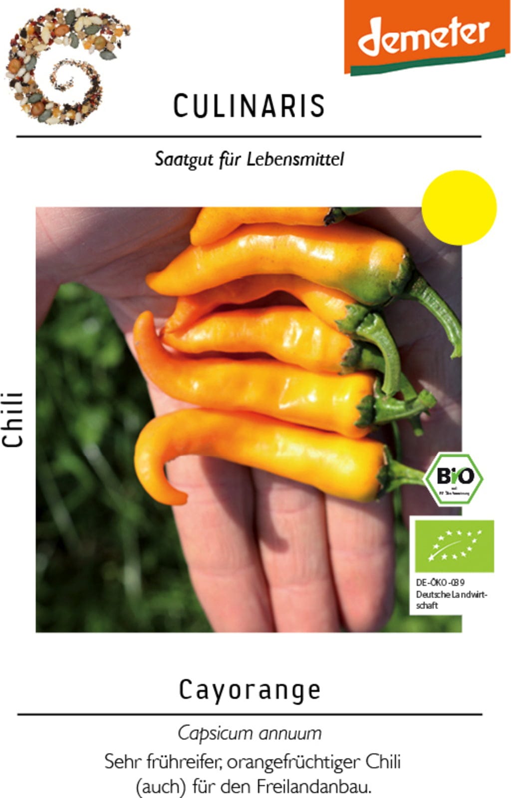 Chilli Cayorange je velmi raná odrůda se zářivě žlutooranžovými plody, které dodají Vaší zahradě barevný akcent. Díky dlouhému období sklizně je výnos obzvláště vysoký a plody přesvědčí svým intenzivním aromatem. Robustní a nenáročná na péči, Cayorange je vhodná jak pro pěstování ve volné půdě, tak pro chráněné kultury.