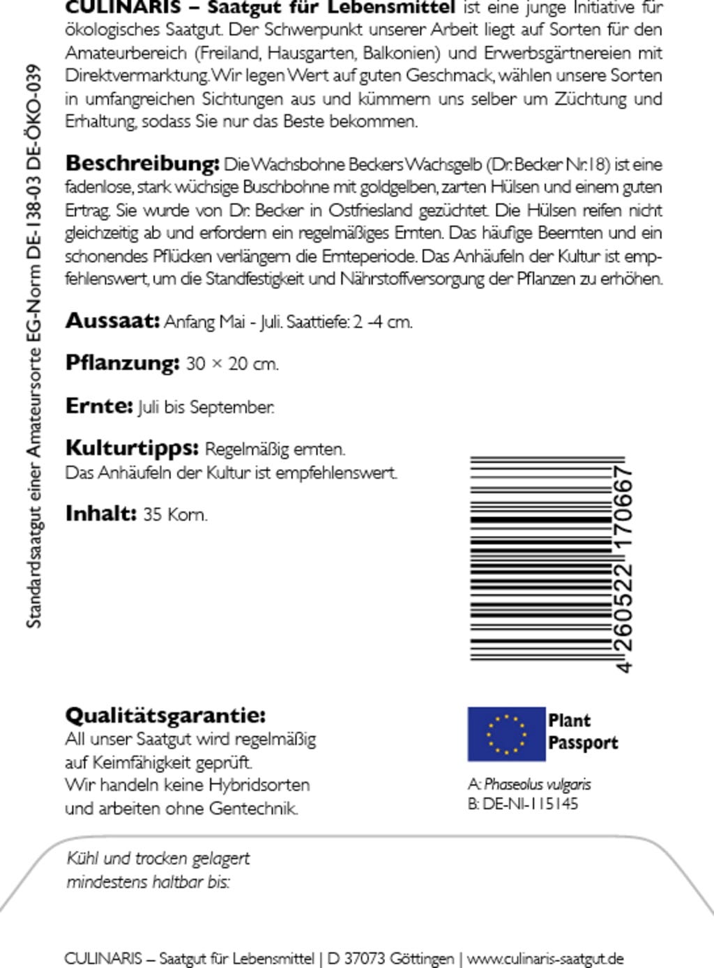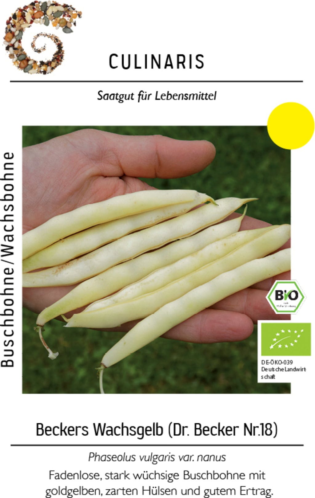Vosková fazole Beckers Wachsgelb je robustní, výnosná keříčková fazole s obzvláště křehkými, zlatožlutými lusky. Fazole bez vláken přesvědčí svou jemnou kvalitou a příjemnou chutí.