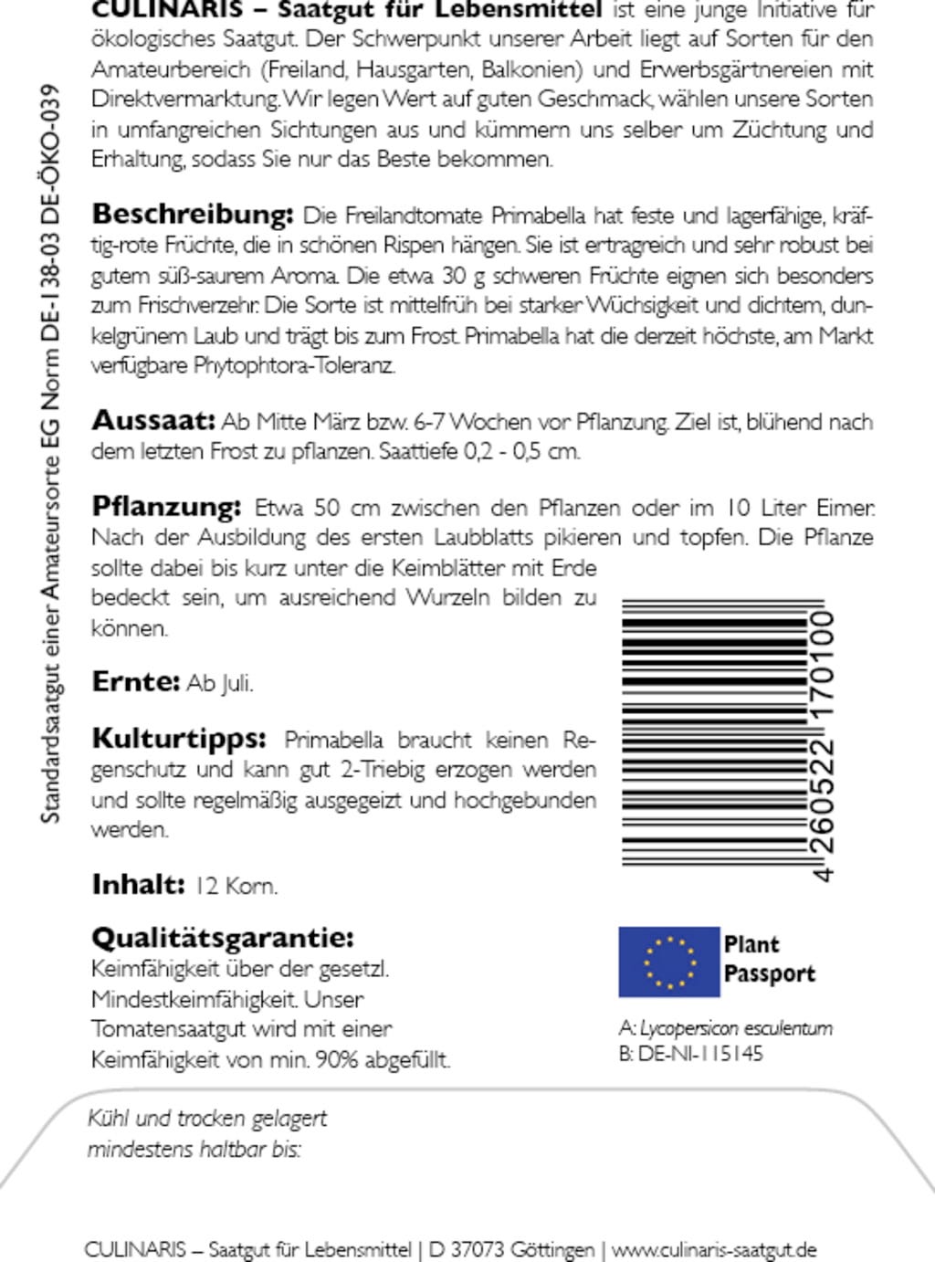| Výrobce: | Culinaris - Saatgut für Lebensmittel, Thiegasse 5, 37124, Rosdorf, Německo, info@culinaris-saatgut.de, culinaris-saatgut.de |