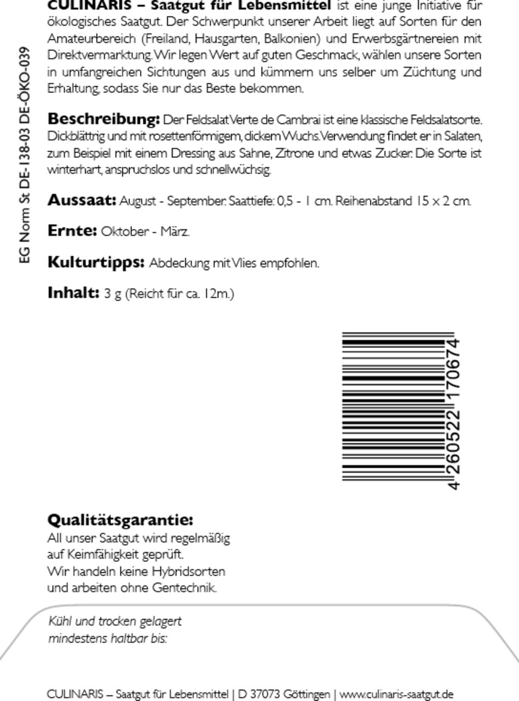 Culinaris Bio polníček "Verte de Cambrai", 3 g