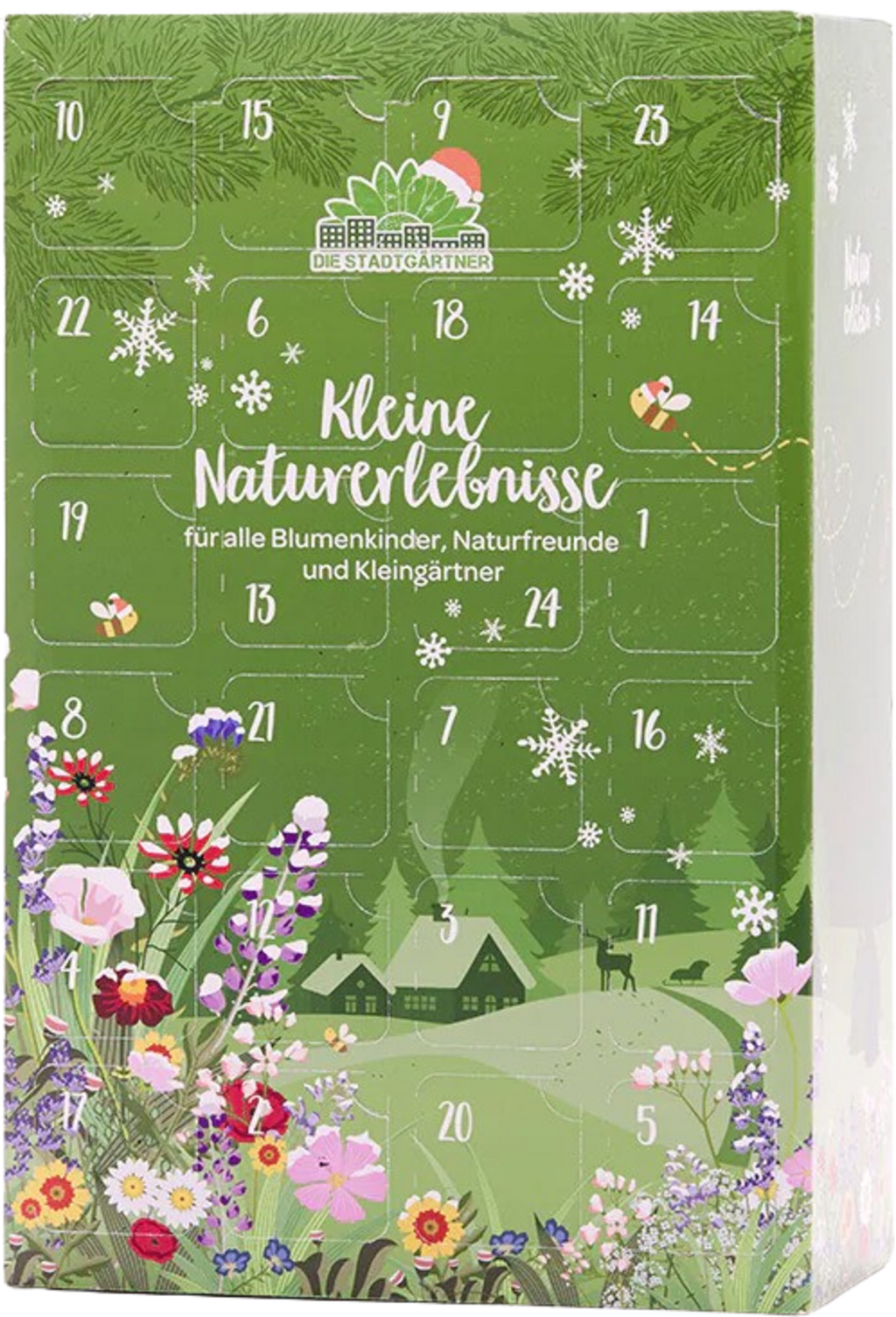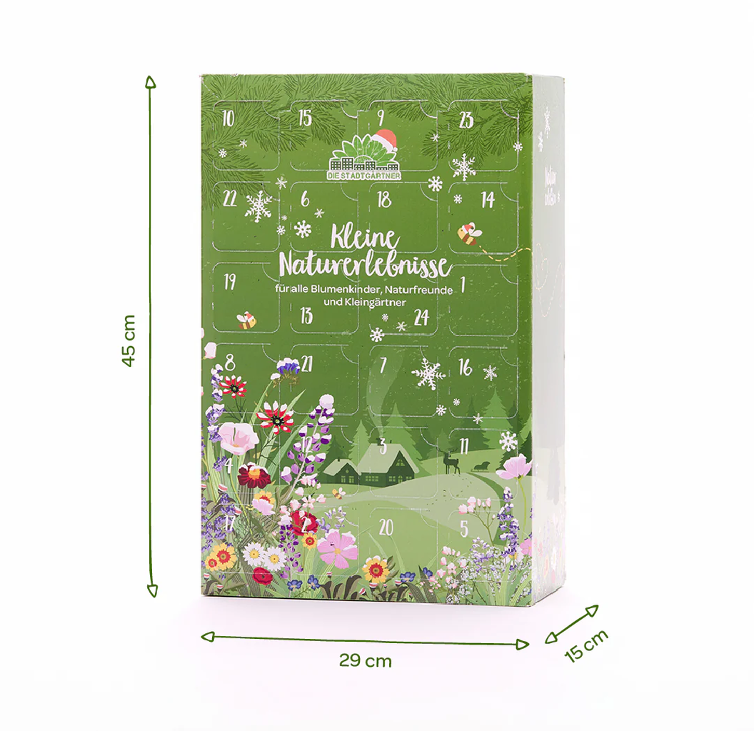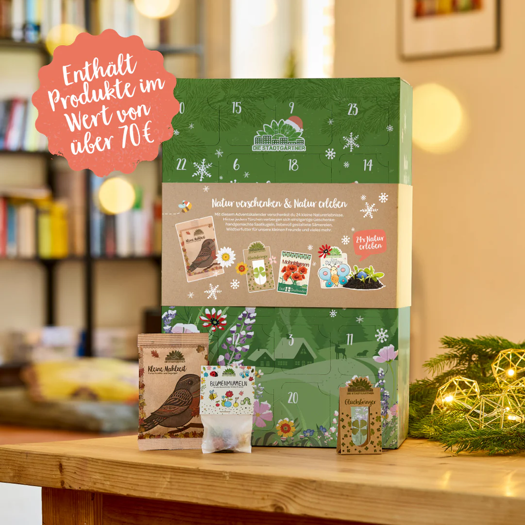 Tento udržitelný adventní kalendář se postará o velkou radost ze zahrady i v předvánočním čase, protože obsahuje 24 s láskou ručně vyrobených produktů pro zahradu z nejprodávanějšího sortimentu značky Die Stadtgärtner. Ať už se jedná o barevné květinové kuličky, talismany pro štěstí nebo semínkové bomby, tento adventní kalendář rozzáří oči malých i velkých hobby zahradníků.