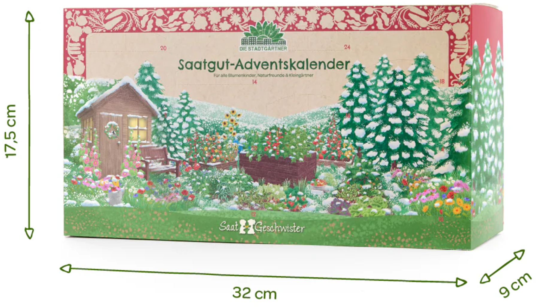 Těšte se na zcela výjimečný advent: Tento dekorativní adventní kalendář ukrývá za 24 okénky skutečné poklady v podobě osiva. Od pestrobarevných květin přes aromatické bylinky až po křupavou zeleninu a čerstvý salát - tento kalendář nabízí rozmanitou směs, která obohatí každý zahradní projekt.