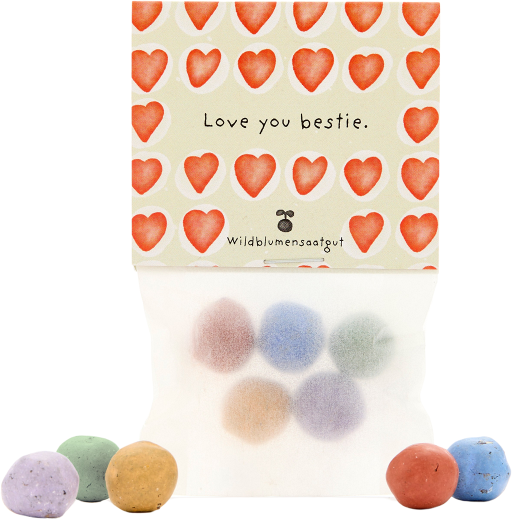 Malý sáček, spousta citů: s „Love You Bestie“ darujete více než jen květiny - darujete uznání, přátelství a udržitelnou radost. Barevné květinové kuličky vnesou do života barvy a nechají Vaše pouto doslova rozkvétat. Zcela bez plastů, ale o to více od srdce: stačí vyhodit, zalít a společně si užívat rozkvetlou nádheru. Ideální k narozeninám, pro malé povzbuzení nebo jen tak pro radost.