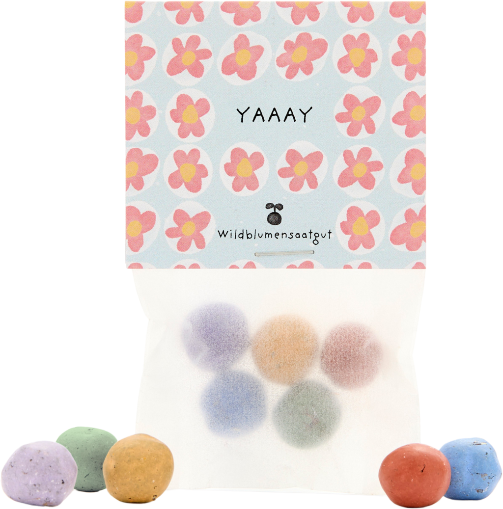 Tento vesele navržený sáček obsahuje 5 barevných květinových kuliček - ideální pro květinovou oslavu výjimečných okamžiků, malých úspěchů nebo dobrých zpráv. Hravý design se zářivým „Yaaay“ se okamžitě postará o dobrou náladu a dělá ze sáčku malého posla štěstí. Obsažené semenné kuličky během okamžiku promění holá místa v kvetoucí oázy pohody.