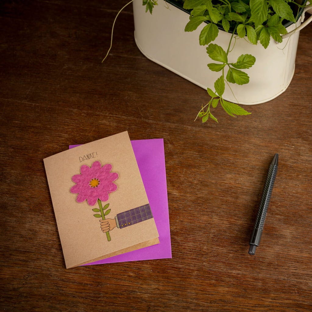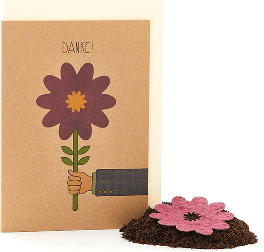 Toto krásné přání je obzvláště okouzlující způsob, jak poděkovat milované osobě. Zde není třeba mnoha slov - která samozřejmě můžete přidat - abyste vyjádřili to, co máte na srdci. Obzvláště skvělé: květina je vyrobena z osivového papíru a je plná semínek. Po zasazení do země brzy vyrostou ty nejkrásnější divoké květiny.