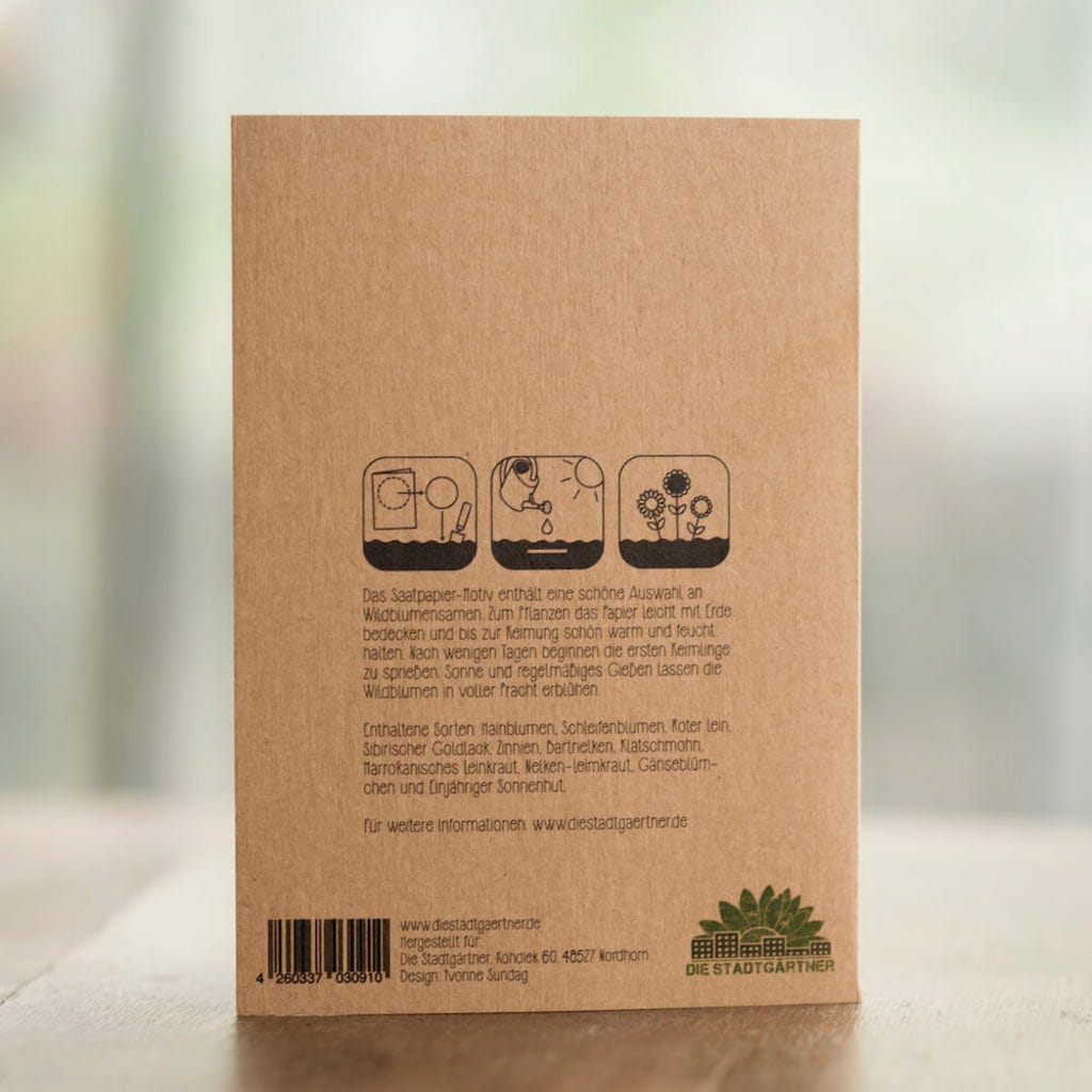 Odstraňte připevněný osivový papír z přání a v květináči nebo ve volné půdě jej lehce zakryjte zeminou. Dbejte na to, aby byl až do vyklíčení v teple a dostatečně vlhký. Po několika dnech byste již měli objevit první klíčky. Pravidelné zalévání a slunce zajistí, že divoké květiny brzy krásně rozkvetou.