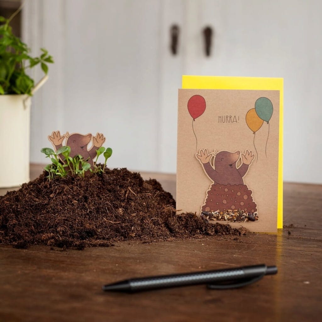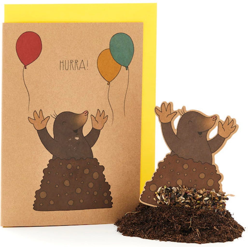 Hurá! Krtek! Se svým neodolatelně roztomilým motivem se toto přání hodí v podstatě vždy, když chcete udělat radost někomu z Vašich blízkých - a ta bude u obdarovaného minimálně stejně velká jako u roztomilého krtka na kartě. Ten je mimochodem odnímatelný a ve svém krtinci skrývá malé tajemství. Zasaďte krtka i s jeho krtincem do hlíny tak, aby malý chlapík stále vykukoval ven. Již po krátké době kolem krtka vyroste spousta krásných divokých květin. Hurá!