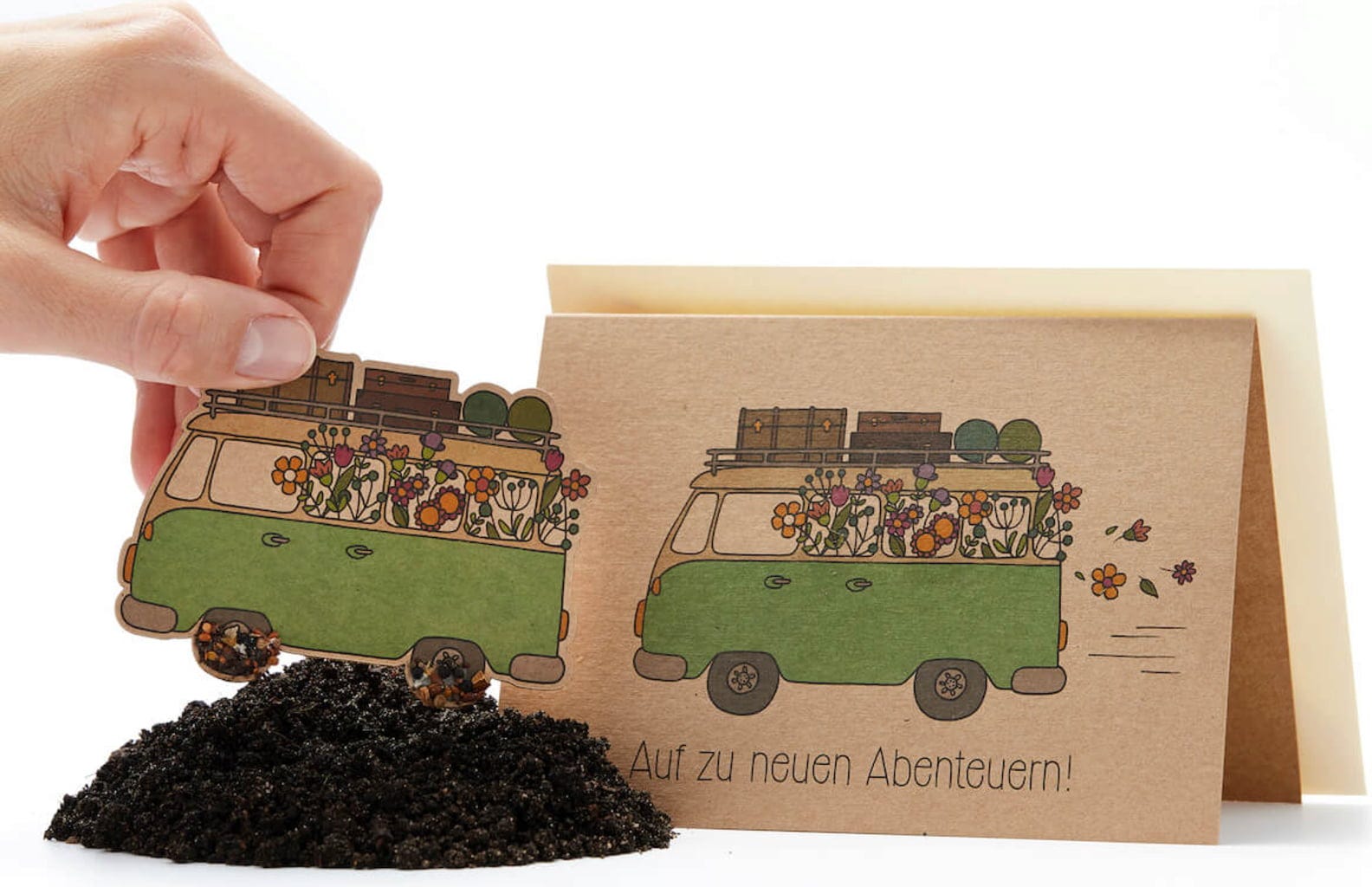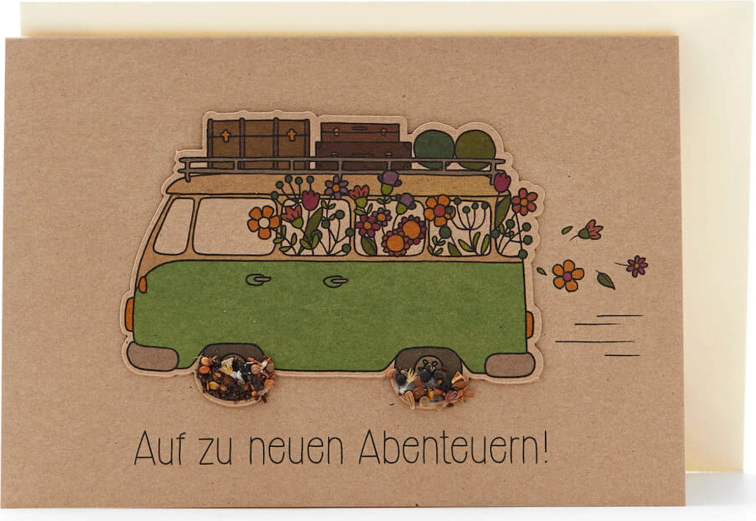 Život je plný dobrodružství, která čekají na to, až je prožijete! Toto přání je dokonalou pozvánkou na příští objevitelskou cestu a zaručeně probudí touhu po dobrodružství. Než se vydáte na další cestu, může se obdarovaný těšit z krásných divokých květin ukrytých v přání. Stačí jednoduše odlepit autobus a vložit jej do hlíny. Teď už jen zalít a brzy se objeví první křehké výhonky.