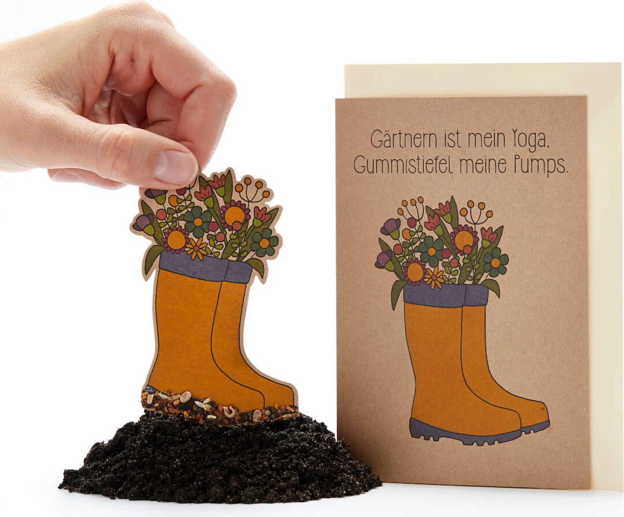Tato s láskou navržená karta je ideálním dárkem pro všechny, kteří svůj čas nejraději tráví na zahradě. Pokud tedy i Vy znáte vášnivého milovníka holínek a hobby zahradníka, můžete mu touto kartou udělat zcela výjimečnou radost. Obzvláště skvělé: Holínky lze sejmout a zasadit do země-brzy vyrostou ty nejkrásnější divoké květiny.