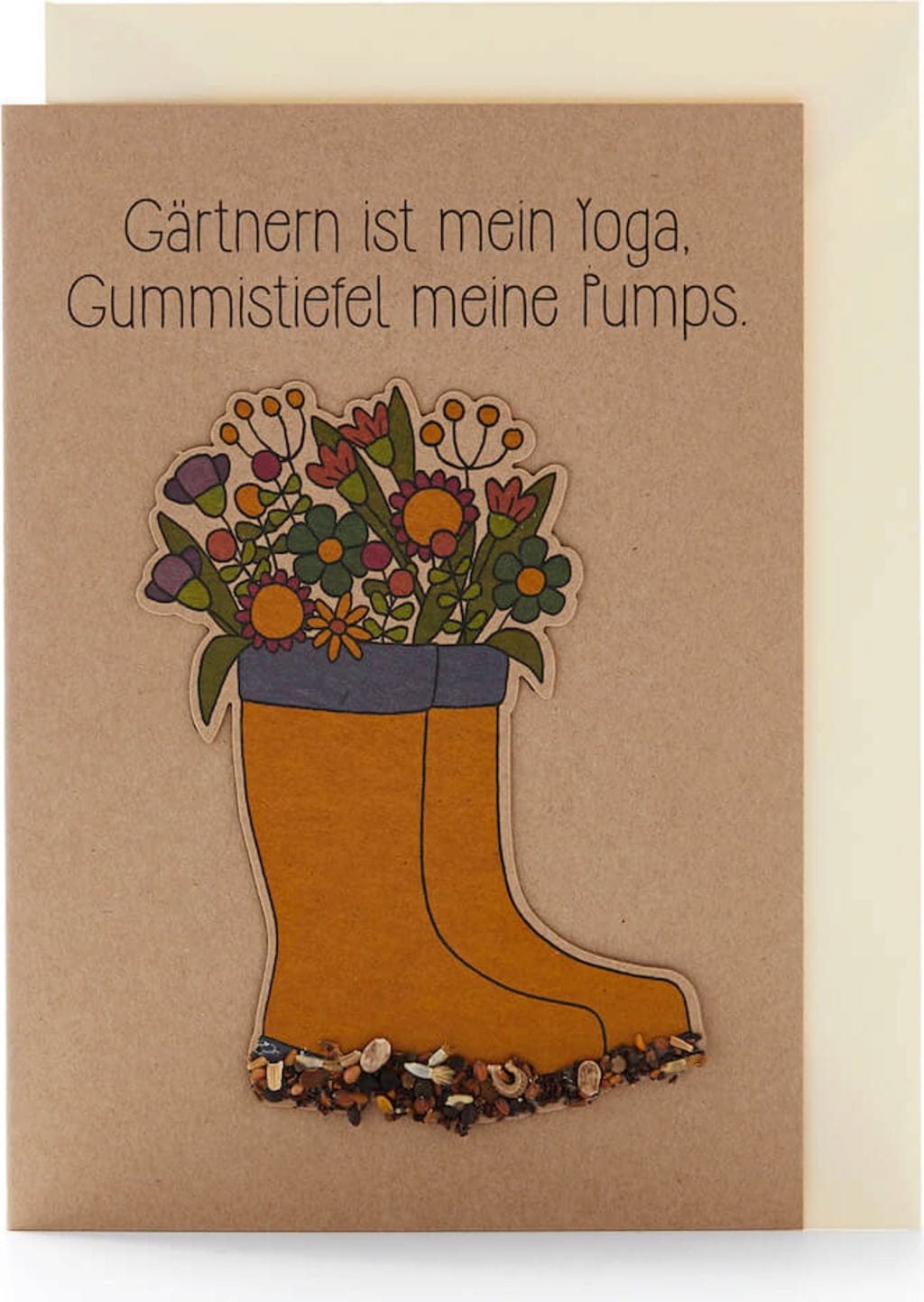 Tato s láskou navržená karta je ideálním dárkem pro všechny, kteří svůj čas nejraději tráví na zahradě. Pokud tedy i Vy znáte vášnivého milovníka holínek a hobby zahradníka, můžete mu touto kartou udělat zcela výjimečnou radost. Obzvláště skvělé: Holínky lze sejmout a zasadit do země-brzy vyrostou ty nejkrásnější divoké květiny.