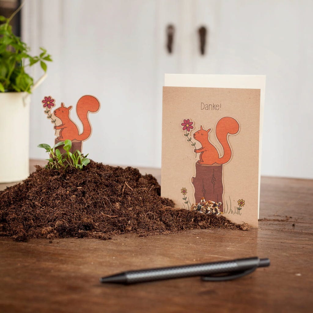 Kdo by mohl poděkovat šarmantněji než tato rozkošná veverka? S kytičkou v tlapce jasně ukáže Vašim blízkým, co cítíte. To ale není zdaleka všechno! Veverku i s kmenem stromu lze z přání vyjmout a zasadit do země. Brzy kolem tohoto roztomilého chlapíka vyrostou nádherné divoké květiny - tak se bude Puschel cítit nejlépe.