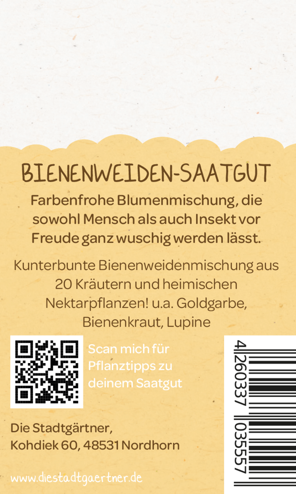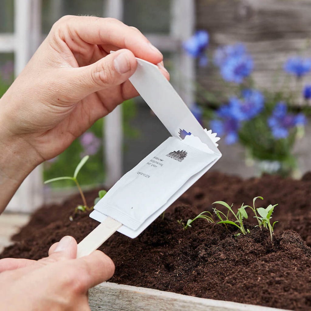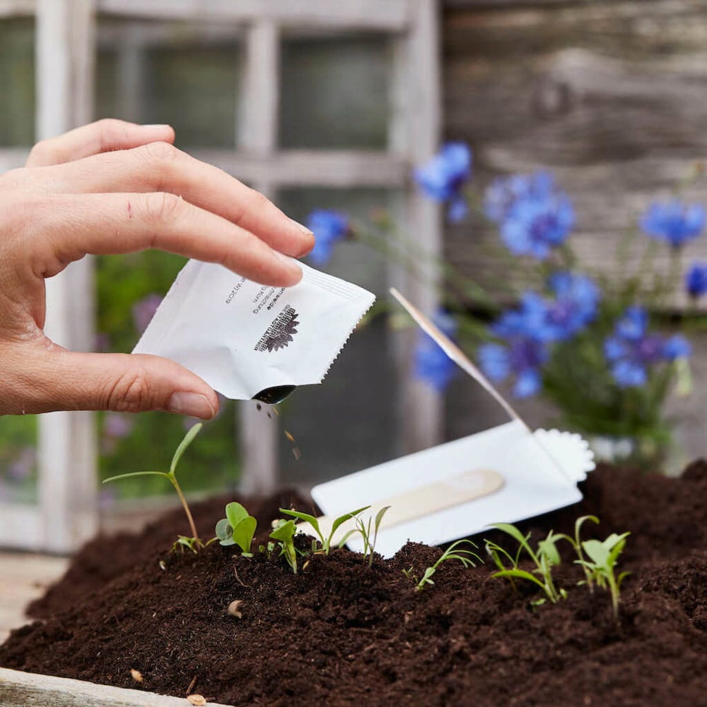 Balíček osiva uvnitř obsahuje více než 20 různých druhů domácích bylinek a nektarodárných rostlin, jako je například řebříček, saturejka a lupina.