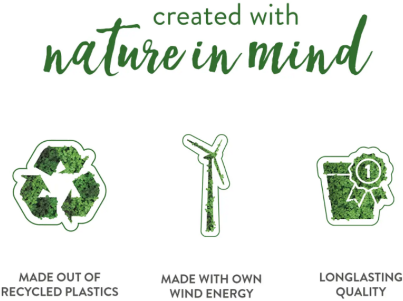| Vlastnosti: | odolný vůči UV záření, odolný proti mrazu, se zavlažovacím systémem, možný odtok vody, nerozbitný, 100 % recyklovatelný, udržitelně vyrobený, odolný vůči povětrnostním vlivům |