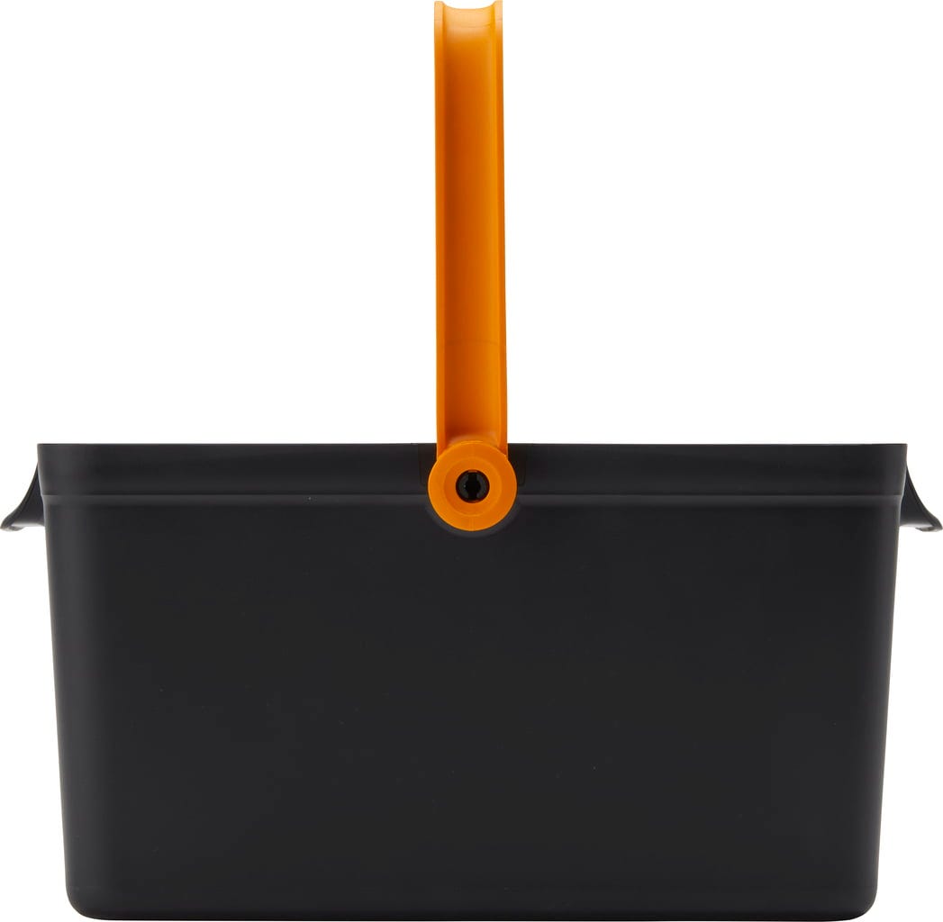 Oranžová rukojeť pro přenášení jednou rukou je pohyblivá, box má navíc praktické boční úchyty pro přenášení oběma rukama. Box je vyroben z lehké syntetické pryskyřice s 20% podílem recyklovaného plastu, je odolný a robustní.