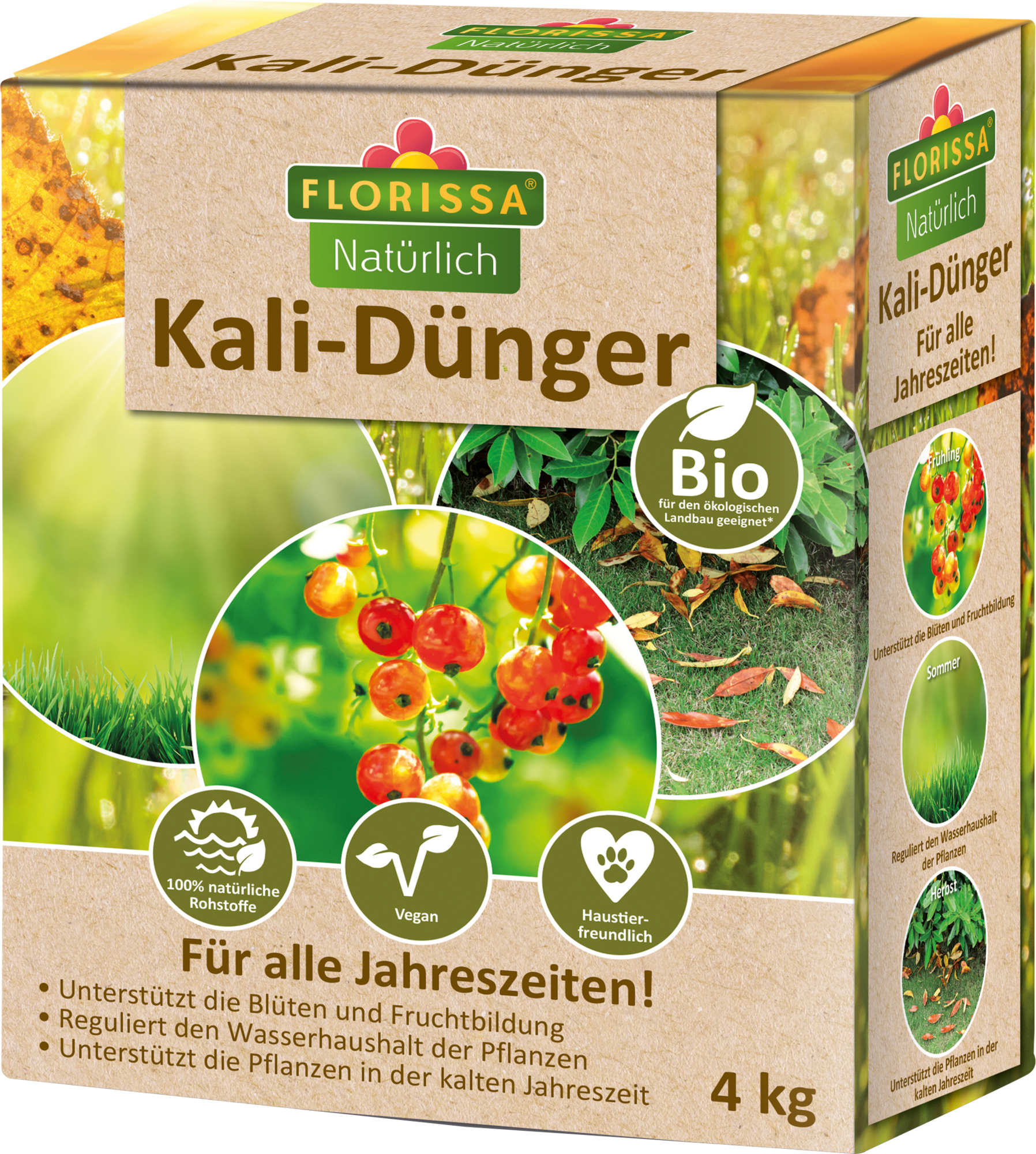 Čistě organické bio draselné hnojivo se výborně hodí k zásobení všech zahradních kultur. Trávník, ovoce, zeleninu, okrasné rostliny a dřeviny jím lze komplexně zásobit a optimálně připravit na zimu. Vysoký podíl draslíku činí rostliny odolnějšími vůči suchu a mrazu. Bio draselné hnojivo navíc na jaře podporuje silný růst rostlin.