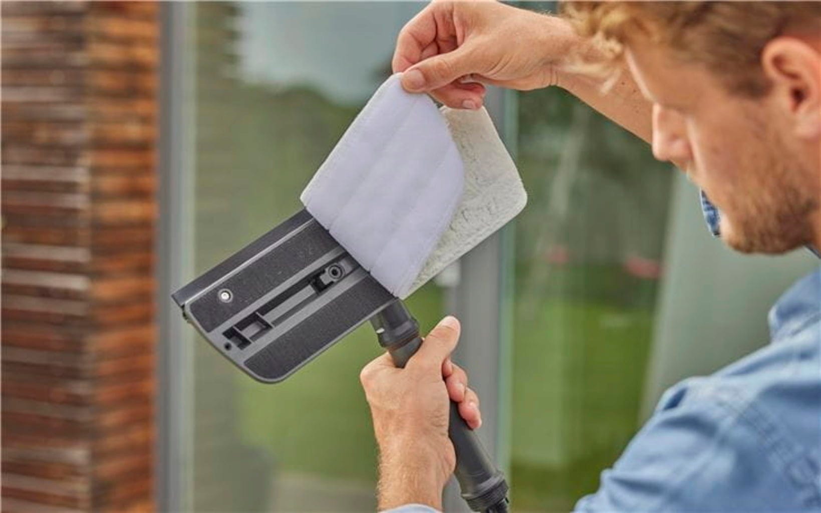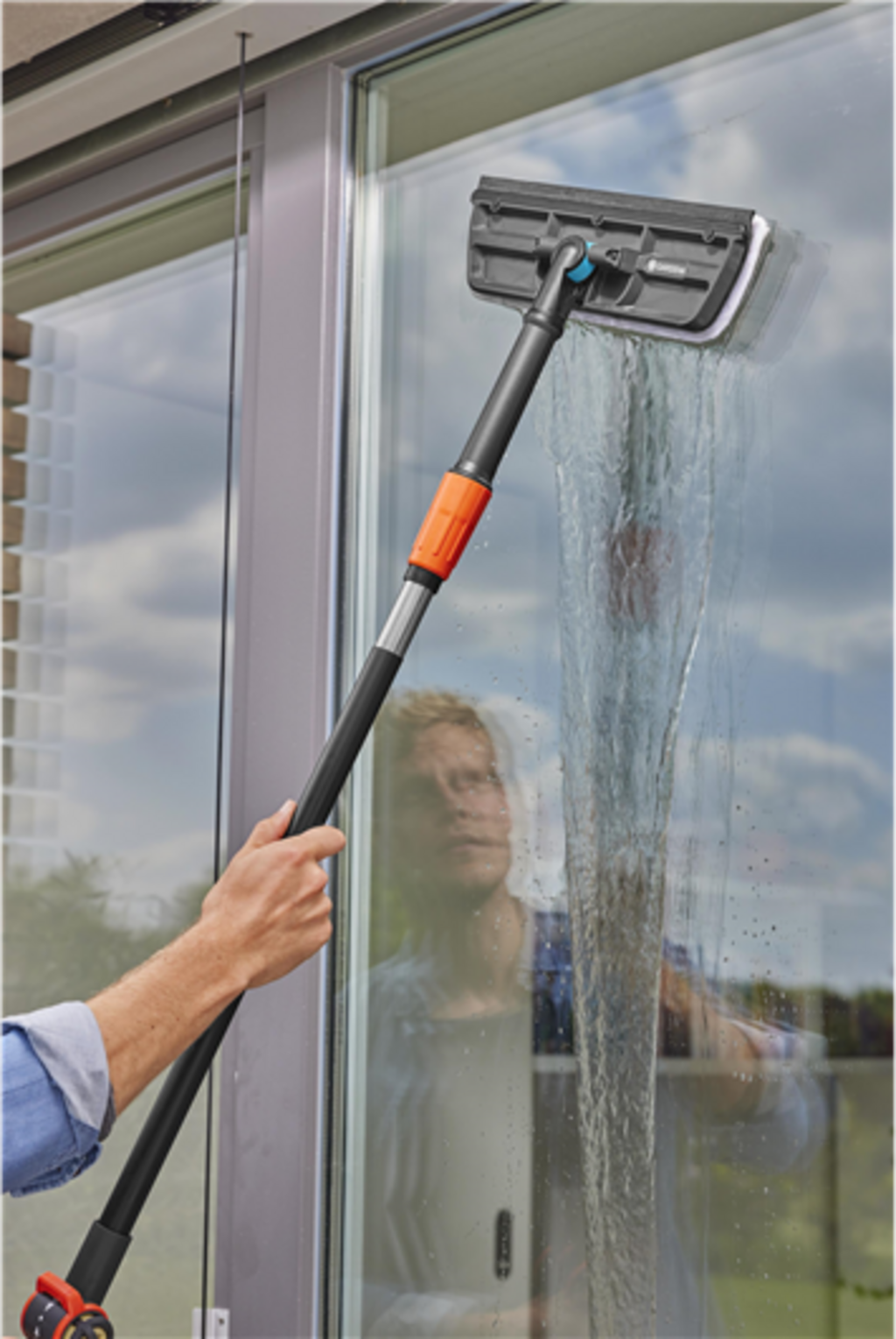 S GARDENA Cleansystem stěrkou na okna budou Vaše venkovní okna zářivě čistá a beze šmouh. Odnímatelné mikrovláknové rouno účinně odstraňuje nečistoty, zatímco odolná gumová lišta stírá vodu a čisticí prostředek ze skleněných ploch bez zanechání stop. Stěrku na okna lze používat buď jako ruční nářadí přímo na zahradní hadici, nebo v kombinaci s průtokovou násadou GARDENA Cleansystem, abyste mohli bez námahy vyčistit i větší plochy.