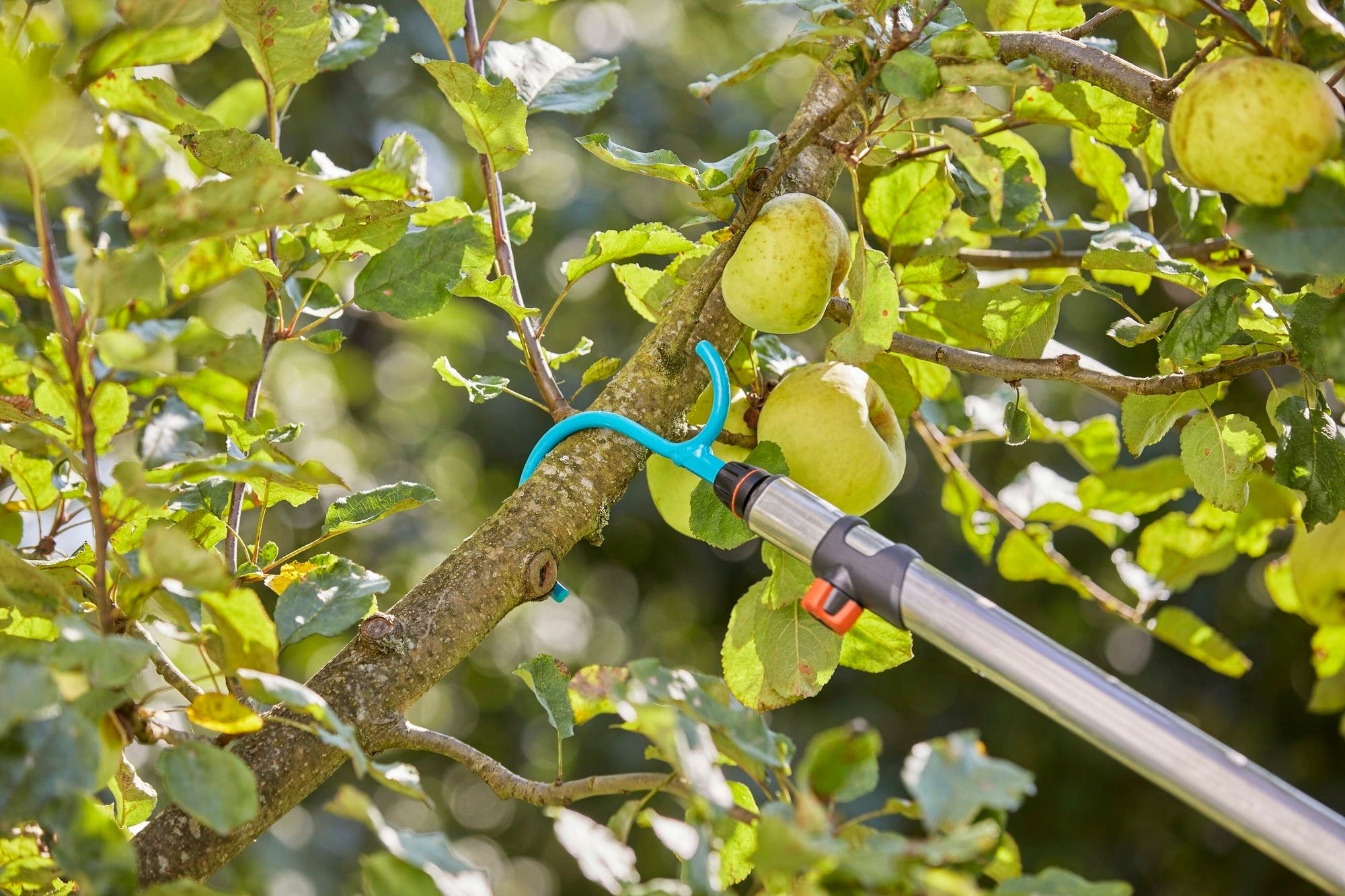 S GARDENA combisystem hákem na větve můžete rychle a snadno setřásat ovoce z větví. Zodpovědný je za to speciální tvar háku ve tvaru S. Hák na větve je však spolehlivým pomocníkem nejen při sklizni, protože jej lze použít také k odstraňování prořezu a k setřásání sněhu.