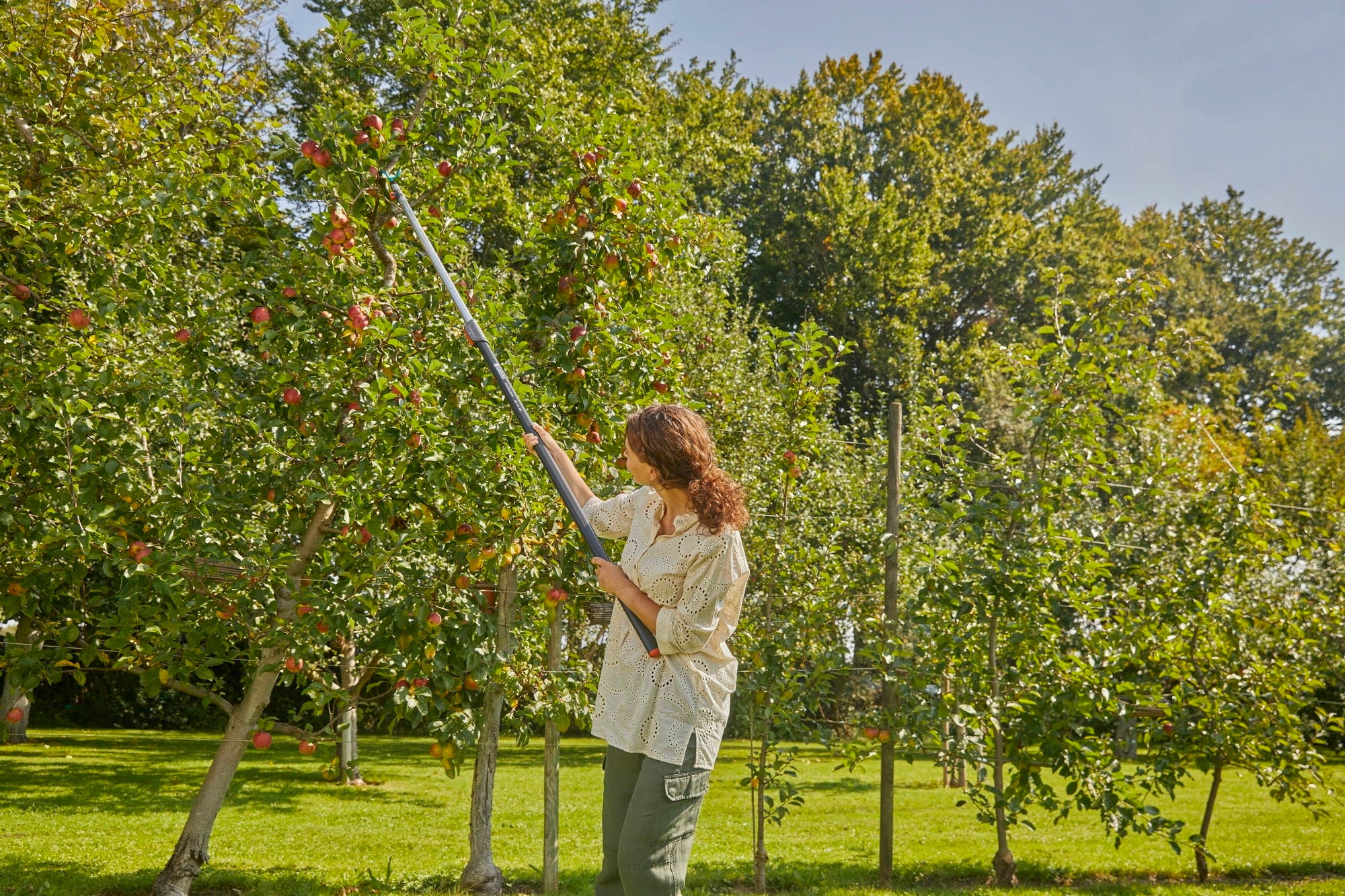 S GARDENA combisystem hákem na větve můžete rychle a snadno setřásat ovoce z větví. Zodpovědný je za to speciální tvar háku ve tvaru S. Hák na větve je však spolehlivým pomocníkem nejen při sklizni, protože jej lze použít také k odstraňování prořezu a k setřásání sněhu.