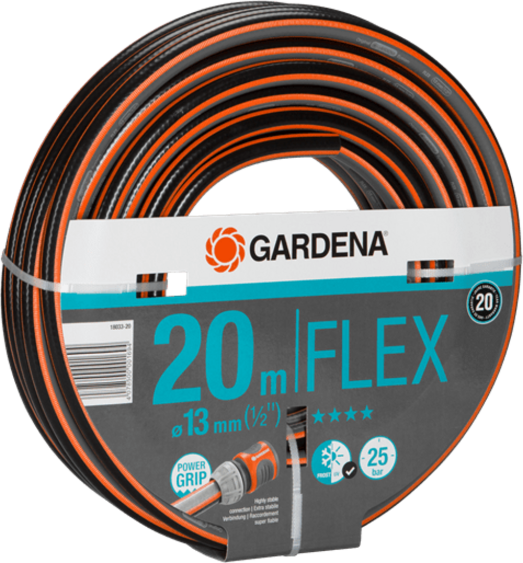 Hadice Comfort FLEX od značky GARDENA s profilem Power-Grip zajišťuje optimální spojení mezi rychlospojkou a hadicí, protože do sebe zapadají jako ozubená kola. Stabilní materiál je odolný vůči tlaku a tvarově stálý, aniž by přitom ztrácel na flexibilitě. S délkou 20 metrů jsou i středně velké zahrady optimálně zásobeny.