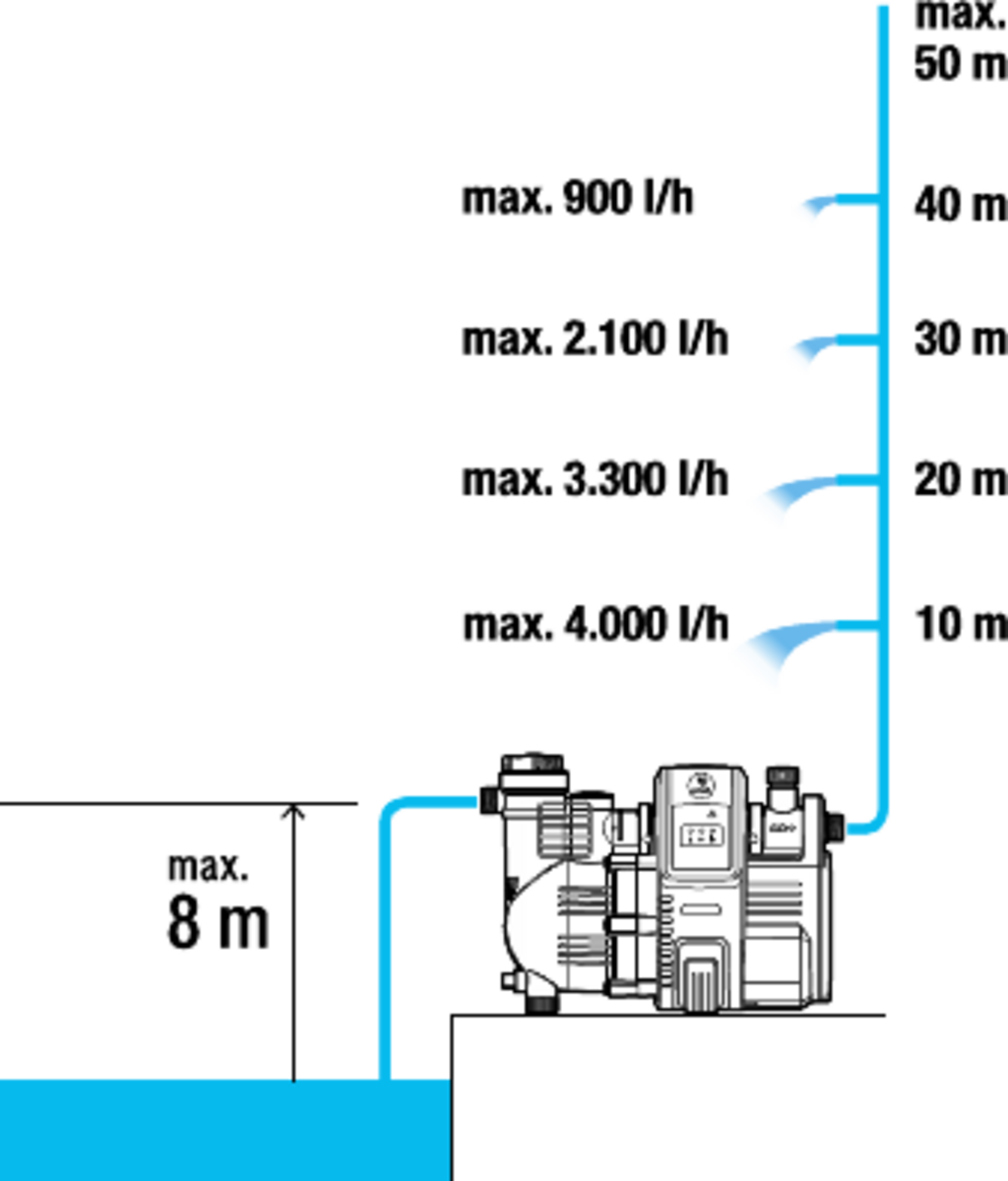 - Optimalizovaný proces sání zajišťuje, že vodu lze načerpat z hloubky až sedmi metrů během několika sekund
