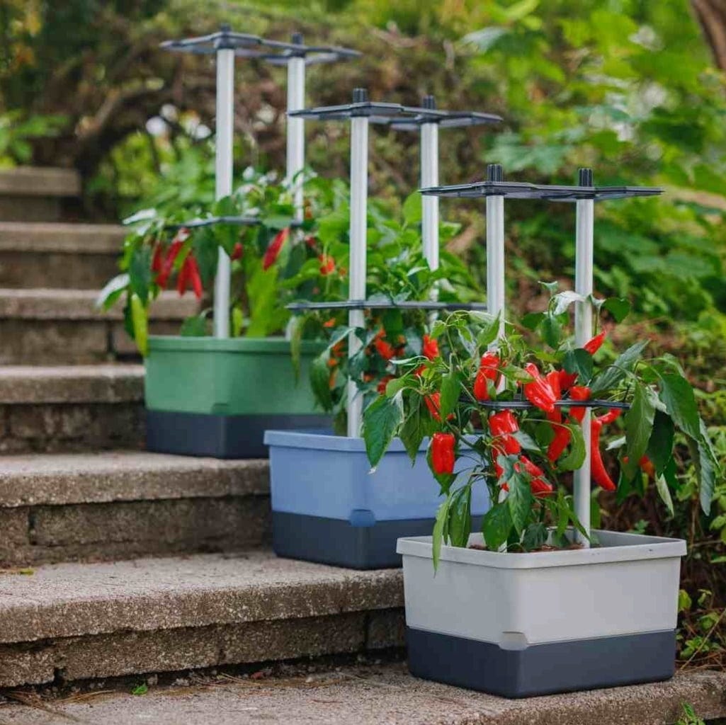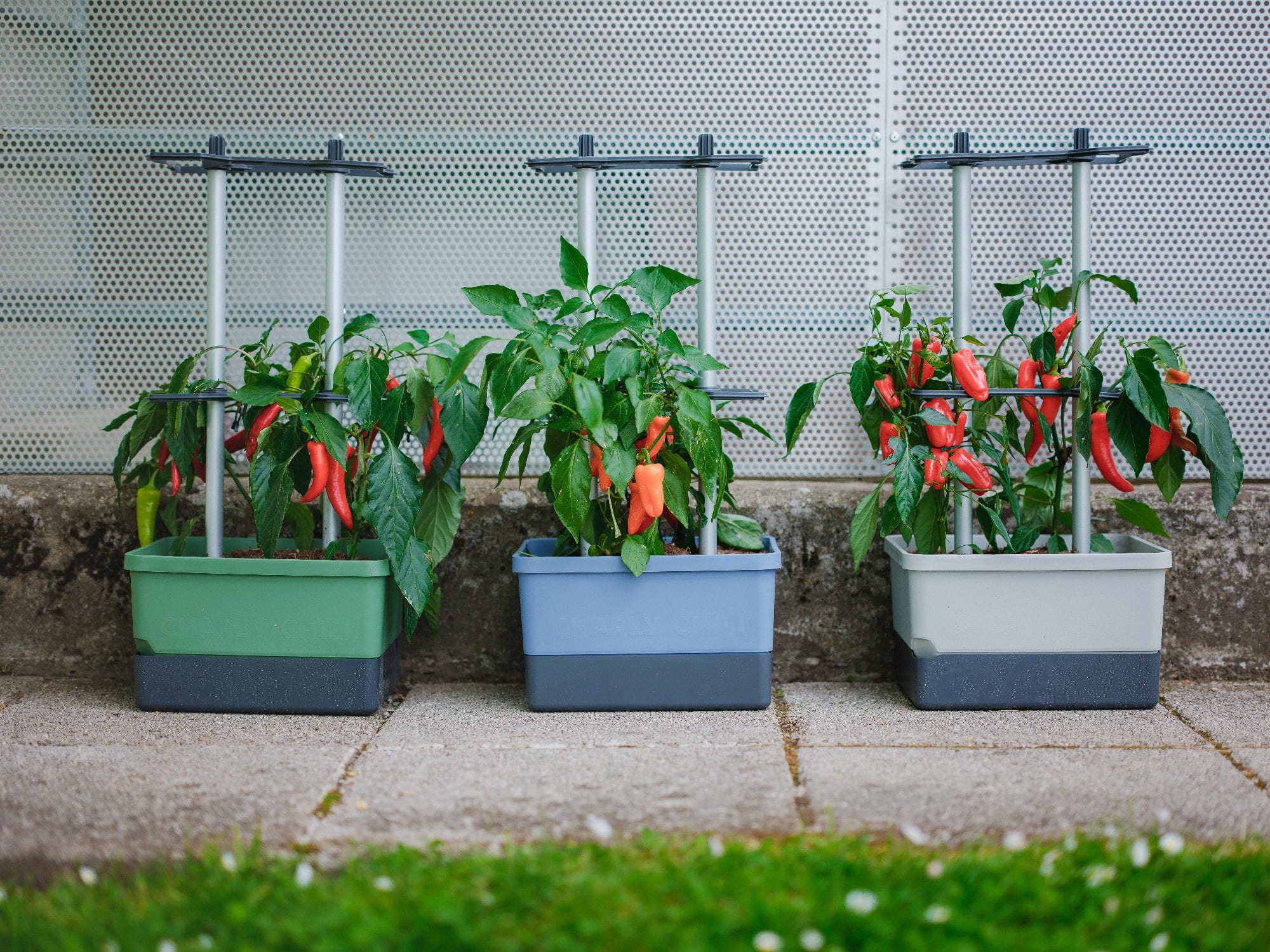 Integrovaný opěrný systém z kvalitního hliníku poskytuje paprikám a chilli potřebnou oporu, zatímco integrovaný zásobník na vodu a zavlažovací pásky zajišťují automatické zásobování rostlin dostatečným množstvím vody. To přináší komfort nejen Vašim rostlinám, ale i Vám. Potřebujete už jen 10 l zeminy a dvě sazenice chilli a můžete začít s výsadbou.