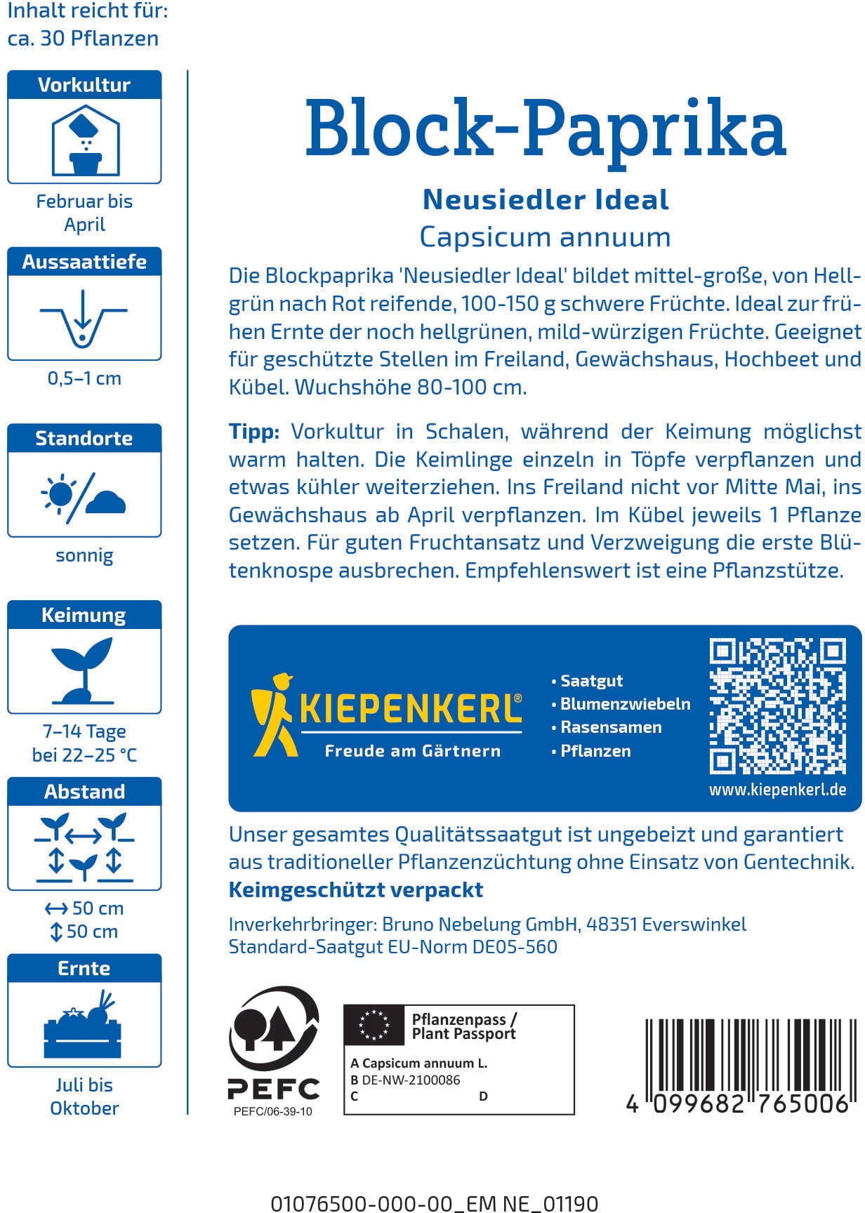 Bloková paprika „Neusiedler Ideal“ je osvědčená, výnosná odrůda pro všechny, kteří mají rádi aromatické a všestranně použitelné plody papriky. Při výšce růstu 80–100 cm vytváří silné rostliny, které při odpovídající péči nasazují velké množství plodů.
