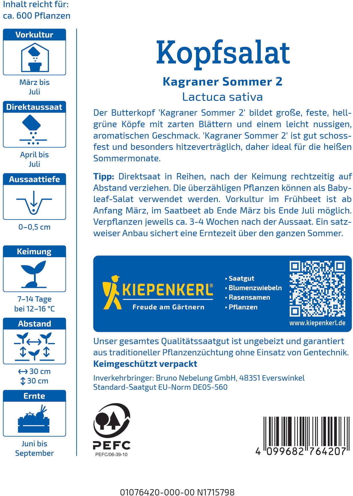 Hlávkový salát „Kagraner Sommer 2“ se vyznačuje jemnou, lehce oříškovou chutí a velkými, pevnými hlávkami. Vhodný pro čerstvé saláty, které lze rychle připravit a které zůstávají křupavé i v horkých letních měsících. S několika okurkami, rajčaty nebo praženými ořechy se stane výraznou součástí každého pokrmu. Ideální pro slunnou zahradu nebo pařeniště – pro dlouhé letní období sklizně plné čerstvých listů!