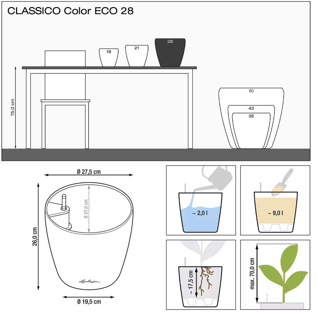 | Vlastnosti: | odolný vůči UV záření, odolný proti mrazu, se zavlažovacím systémem, možný odtok vody, nerozbitný, 100 % recyklovatelný, udržitelně vyrobený |
