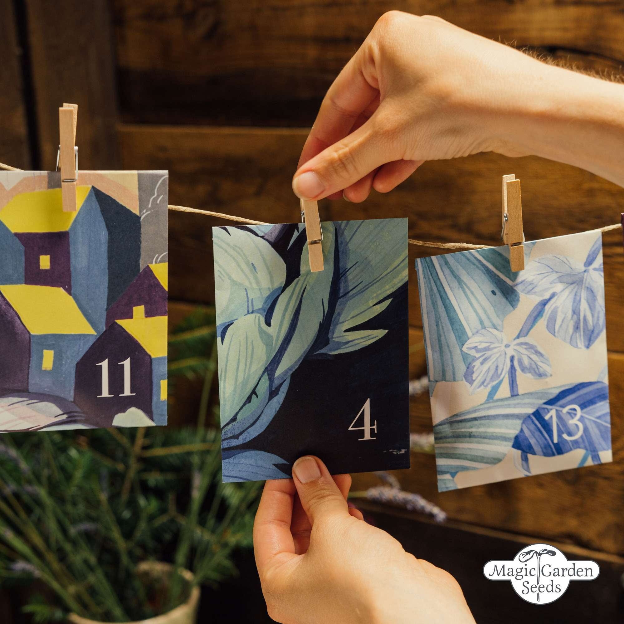 Je to kouzelné! Tento s láskou navržený a velmi dekorativní adventní kalendář je přesně to pravé, co zkrátí čekání na Vánoce nadšeným i začínajícím městským zahradníkům. 24 sáčků kalendáře se připevňuje na šňůru pomocí malých kolíčků na prádlo a tvoří obzvláště stylovou adventní dekoraci, která Vás během okamžiku naladí na kouzelnou vánoční atmosféru.