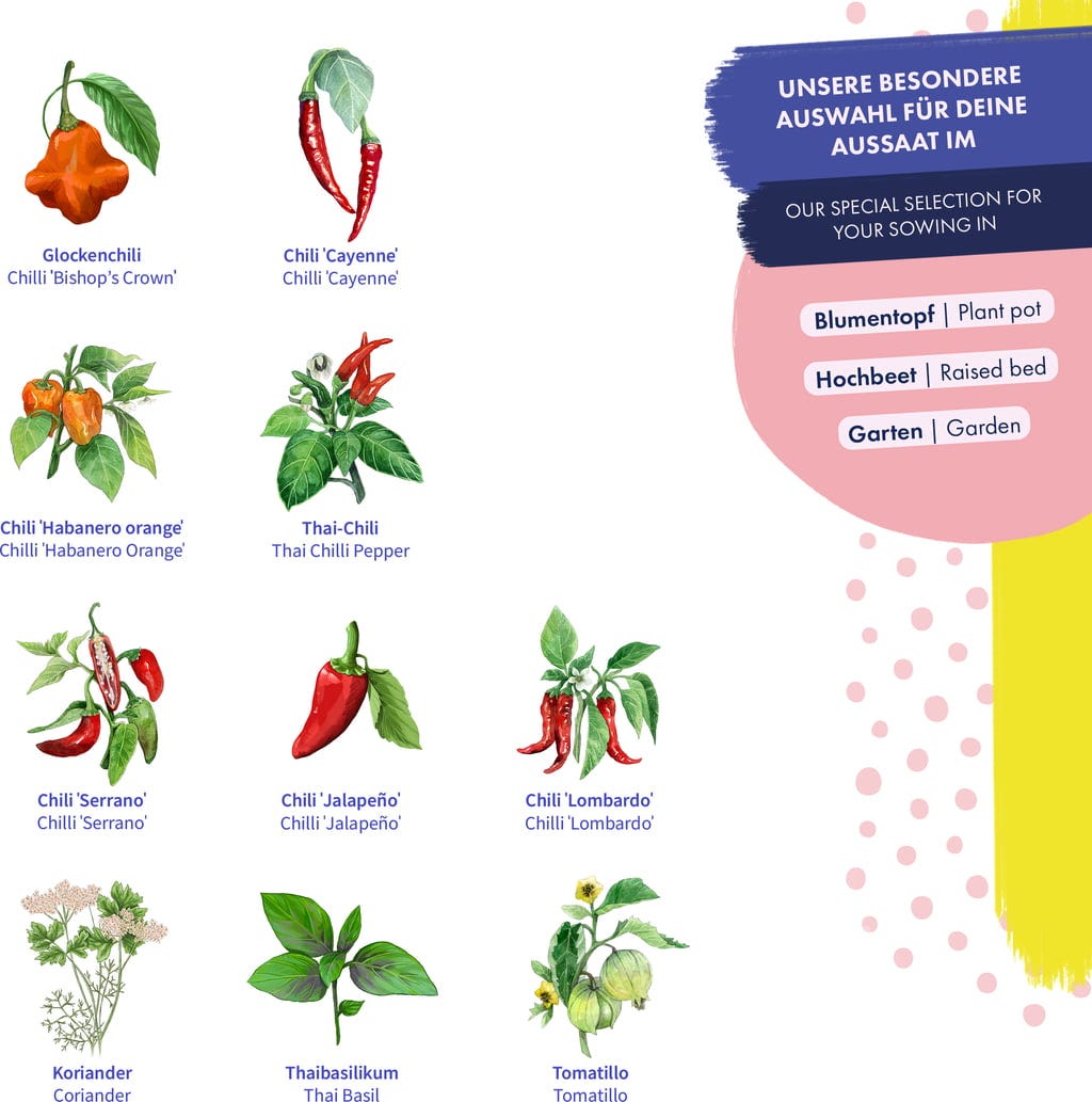 Tato sada obsahuje 7 zajímavých druhů chilli a 3 k nim se hodící bylinky. Od jemných až po nepředstavitelně pálivé - zde si vybere každý podle své chuti a příležitosti. Všechny odrůdy můžete pěstovat na záhoně, ale také na balkoně nebo terase.