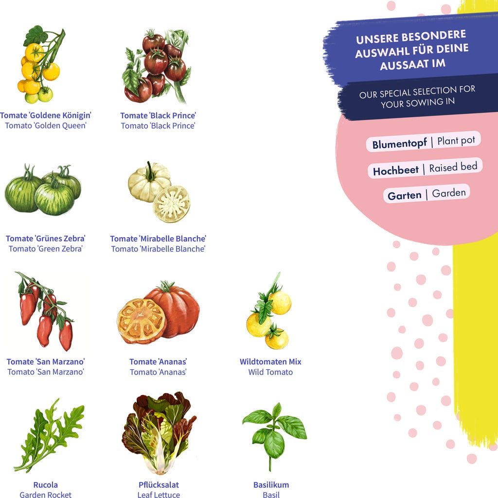 Tato sada obsahuje 7 barevných odrůd rajčat a 3 perfektní partnery, kteří spolu chuťově skvěle ladí. Všechny odrůdy můžete pěstovat na záhonu, ale také na balkoně nebo terase. Pro ještě více barev na Vašem talíři.