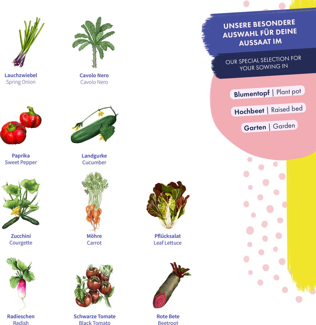 Tato sada obsahuje 10 nehybridních odrůd zeleniny, které se snadno pěstují a vyžadují minimum místa. Jsou proto ideální pro pěstování ve vyvýšených záhonech.