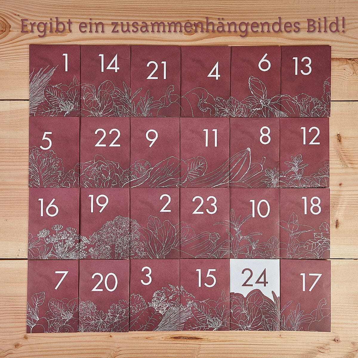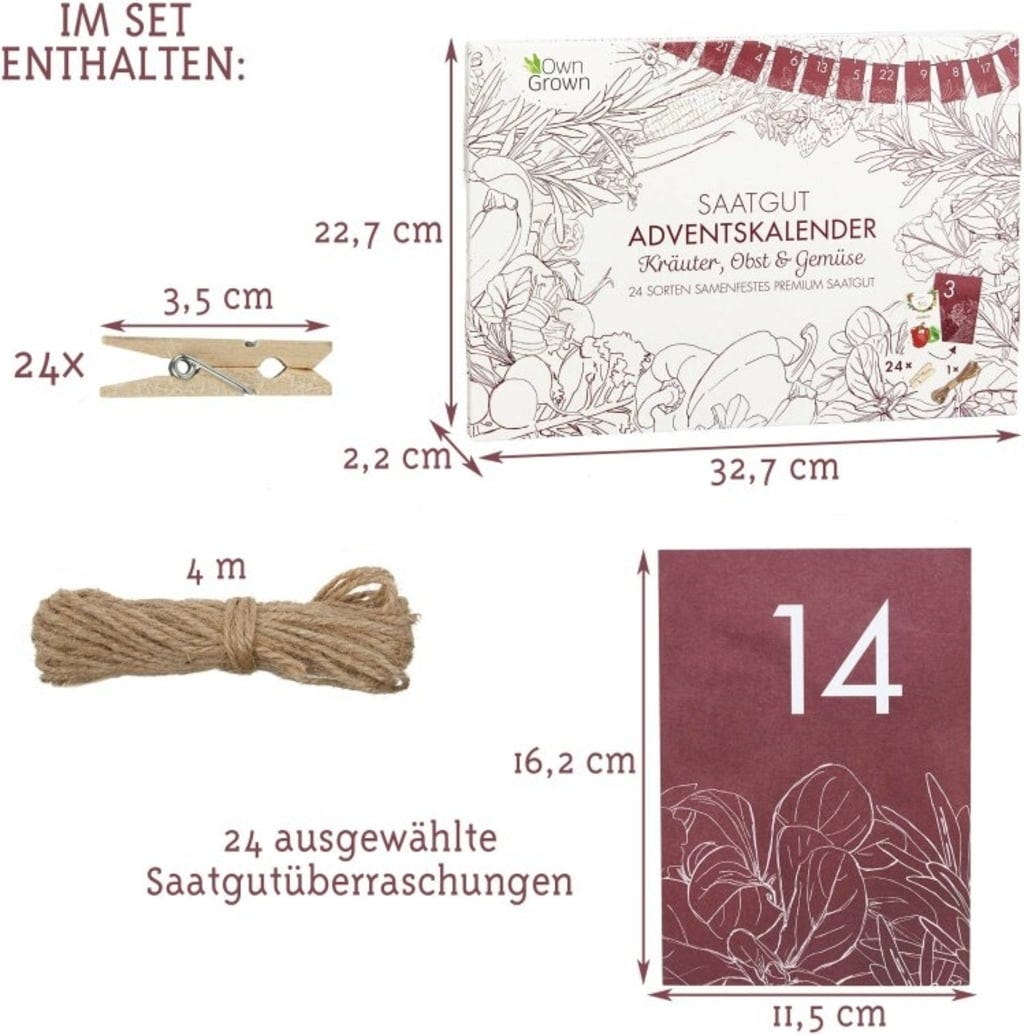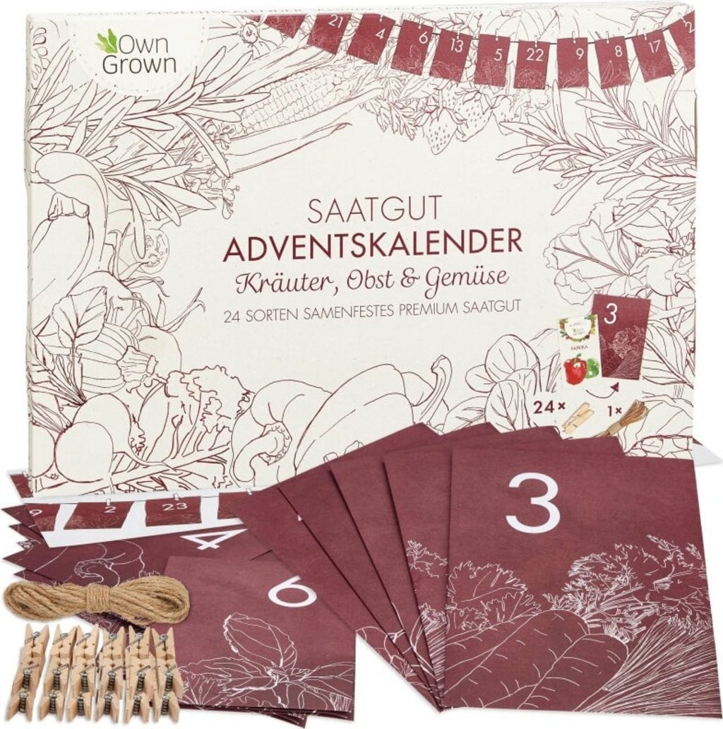 Se semenovým adventním kalendářem je čekání na svátky obzvlášť příjemné, protože až do Vánoc se můžete každý den těšit na malé překvapení. V nádherně ilustrovaném adventním kalendáři se nachází celkem 24 sáčků s vybranými druhy zeleniny, ovoce a bylinek. Součástí sady je také jutový provázek a dřevěné kolíčky, díky nimž si můžete půvabné sáčky dekorativně zavěsit u sebe doma. Na zadní straně každého balení semen naleznete navíc tipy a informace k výsevu, péči i konzumaci jednotlivých rostlin (DE). Nyní už jen trocha trpělivosti - první semena můžete vysévat v únoru nebo březnu.