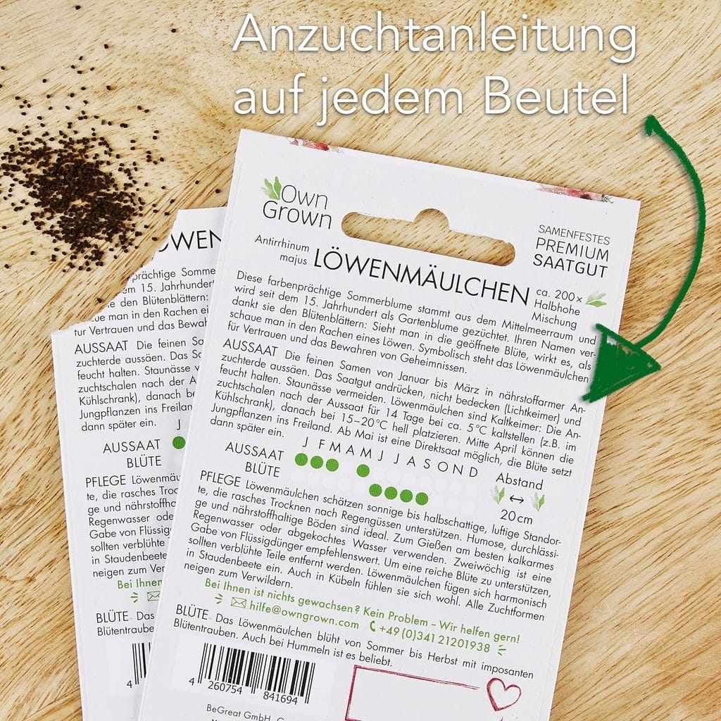 S touto sadou dodáte Vaší zahradě nostalgický a romantický nádech. Jednoleté i víceleté druhy jsou skutečnými magnety pro včely, čmeláky a motýly. Na zadní straně každého sáčku naleznete tipy k výsevu, péči a další užitečné informace (DE). V závislosti na druhu je možné pěstování na balkoně nebo ve volné půdě.