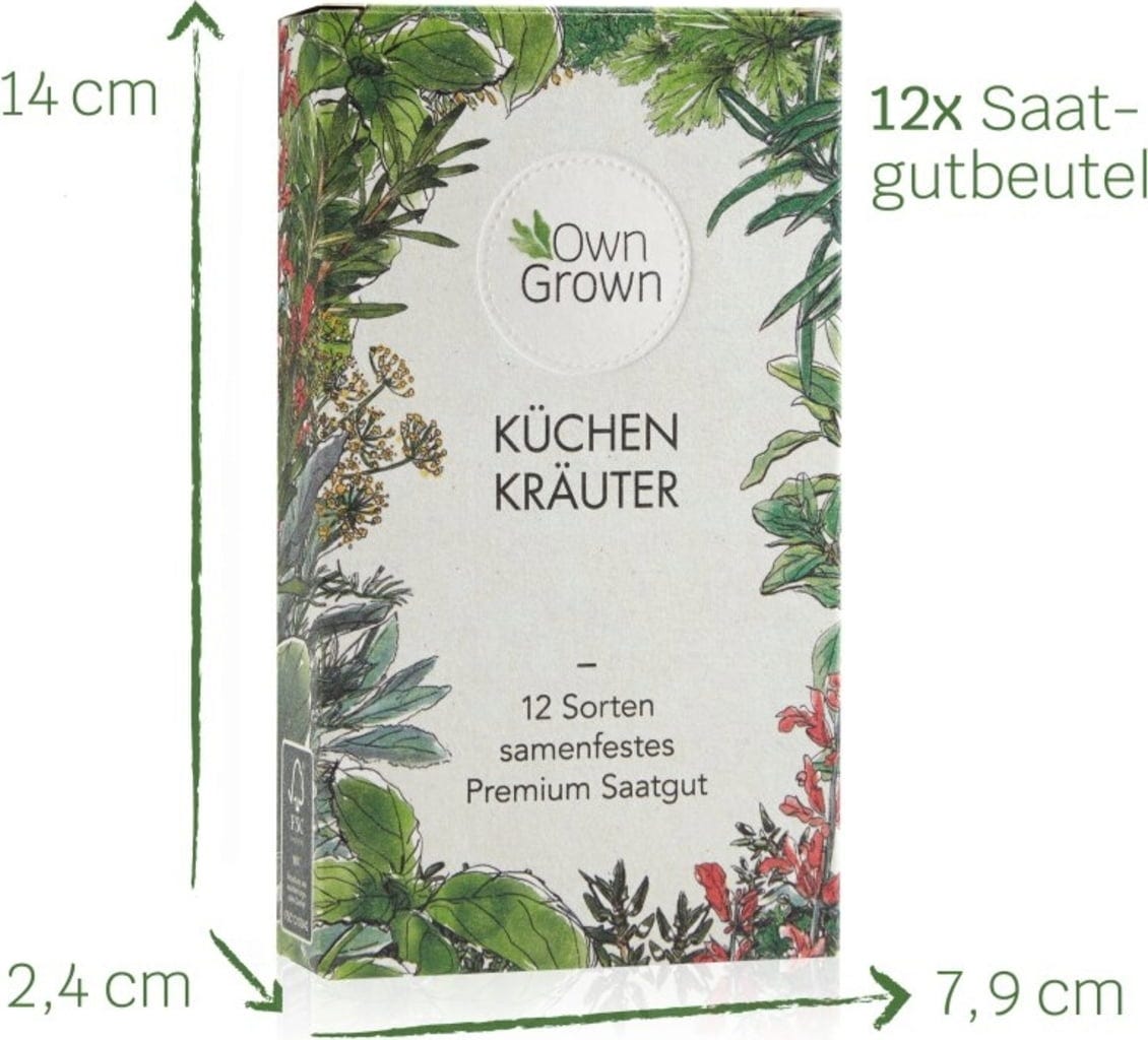S touto sadou se Váš sen o vlastním bylinkovém zahrádce stane skutečností. Dvanáct pečlivě vybraných druhů nabízí bohatou kulinářskou rozmanitost a potěší i smysly svými intenzivními aromaty. Na zadní straně každého sáčku naleznete tipy k výsevu, sklizni a další užitečné informace (DE). V závislosti na druhu je možné pěstování na okenním parapetu, v květináči nebo na bylinkovém záhonu. Díky krásnému vnějšímu balení je sada kuchyňských bylinek ideální také jako dárek nebo drobná pozornost.