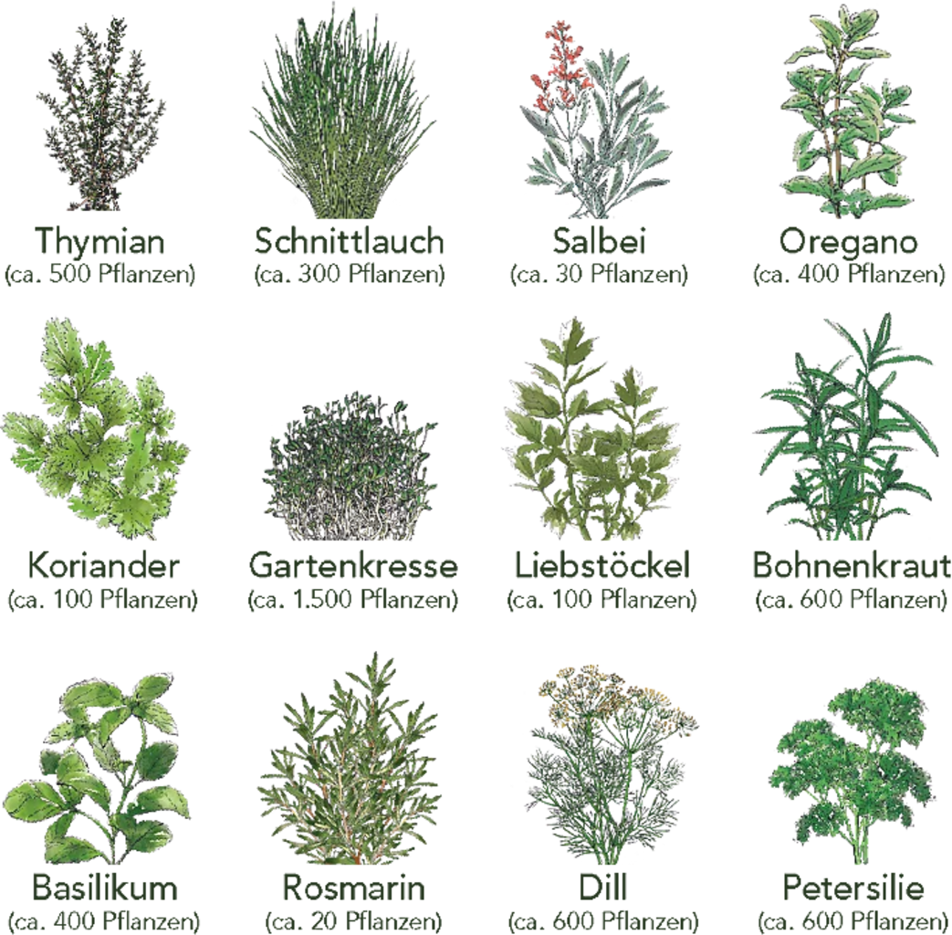 bazalka, pažitka, kopr, koriandr, řeřicha, petržel, tymián, šalvěj, rozmarýn, oregano, saturejka, libeček