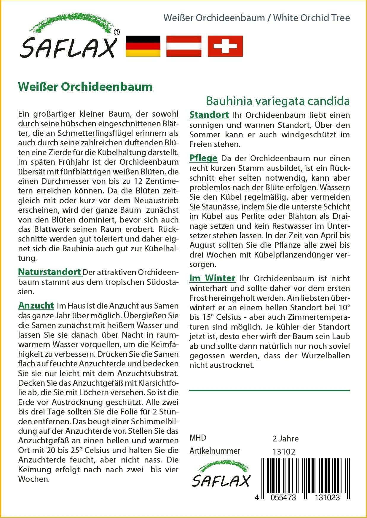 Bílý orchidejový strom rozkvétá v plné kráse koncem jara. Protože tento malý strom není mrazuvzdorný, je vhodný především pro pěstování v nádobách. Miluje slunná stanoviště a v létě může být umístěn i venku na místě chráněném před větrem.