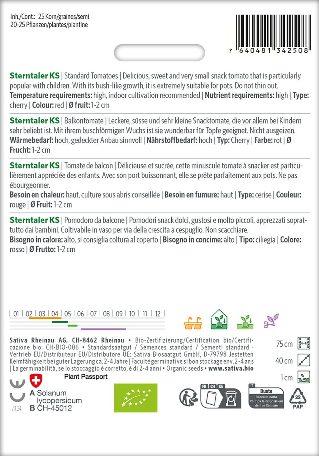 Balkonové rajče Sterntaler KS nadchne sladkými, malými snack rajčaty, která jsou oblíbená zejména u dětí. Jeho kompaktní, keříčkovitý vzrůst je ideální pro pěstování v květináčích. Stačí ho nechat růst - zaštipování není nutné.